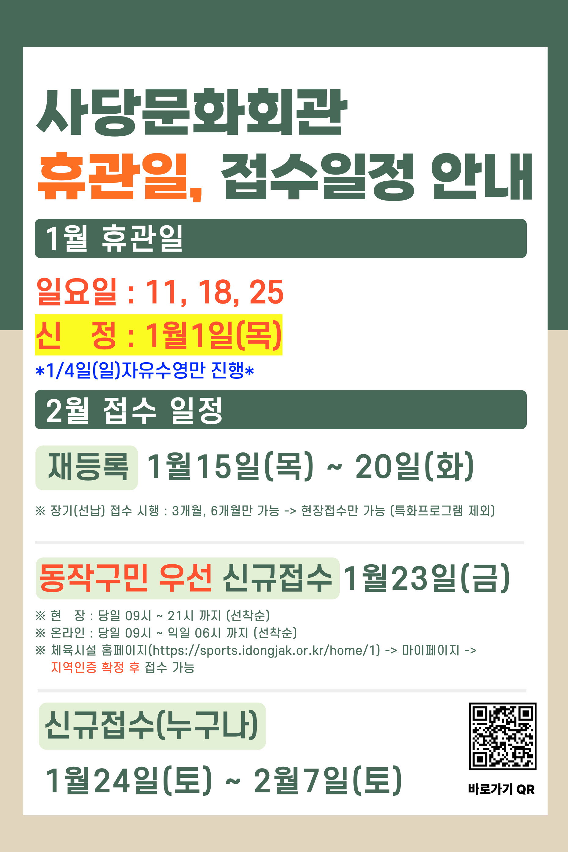 사당문화회관 사당문화회관 1월 휴관일 및 2월 접수일정 안내 작성자 사당문화회관 작성일 2025년 12월 23일 17시 9분 5초 조회 205 휴관일-접수-일정-008 (1).jpg [ Size : 552.23KB , Down : 170 ] 미리보기 다운로드 목록보기