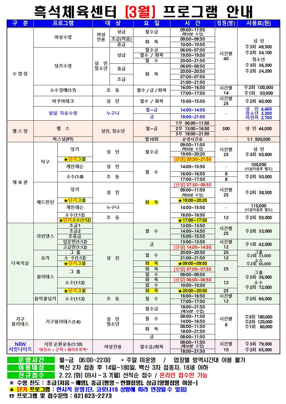 흑석체육센터 흑석체육센터 3월 프로그램 안내 작성자 흑석체육문화센터 작성일 2022년 2월 14일 15시 1분 13초 조회 977 3월 프로그램 안내(흑석) 2.18777001.jpg [ Size : 288.65KB , Down : 559 ] 미리보기 다운로드 목록보기