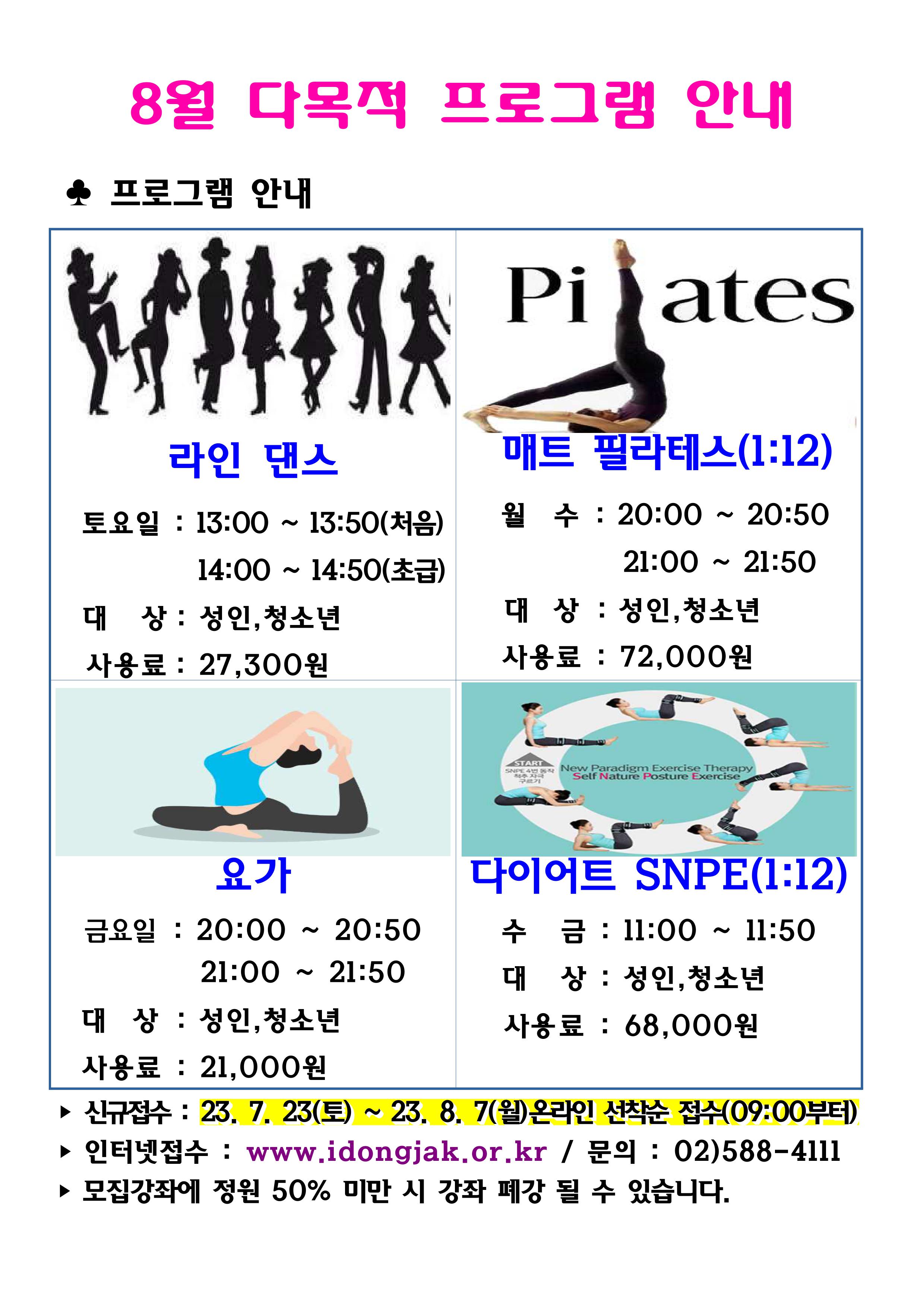 사당문화회관 사당문화회관 8월 다목적 프로그램 회원모집 안내 작성자 동작구민체육센터 작성일 2023년 7월 3일 15시 20분 44초 조회 606 8월 다목적 프로그램 4분할.jpg [ Size : 638.43KB , Down : 281 ] 미리보기 다운로드 목록보기