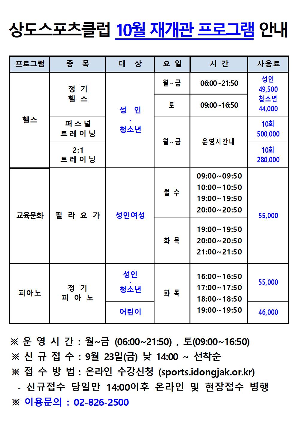 상도스포츠클럽 상도스포츠클럽 10월 프로그램 안내 작성자 상도스포츠클럽 작성일 2022년 9월 21일 12시 49분 26초 조회 835 10월 프로그램 안내 (상도스포츠클럽)001.jpg [ Size : 173.62KB , Down : 403 ] 미리보기 다운로드 목록보기