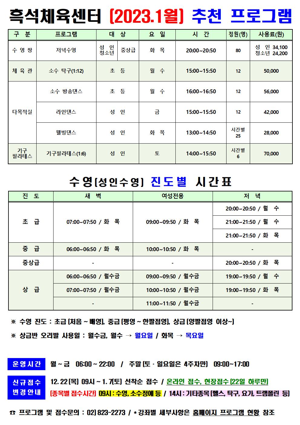 흑석체육센터 흑석체육센터 (2023.1월) 추천 프로그램 안내 작성자 흑석체육문화센터 작성일 2022년 12월 14일 14시 20분 16초 조회 924 1월 프로그램 안내(흑석)신규001.jpg [ Size : 204.35KB , Down : 568 ] 미리보기 다운로드 목록보기