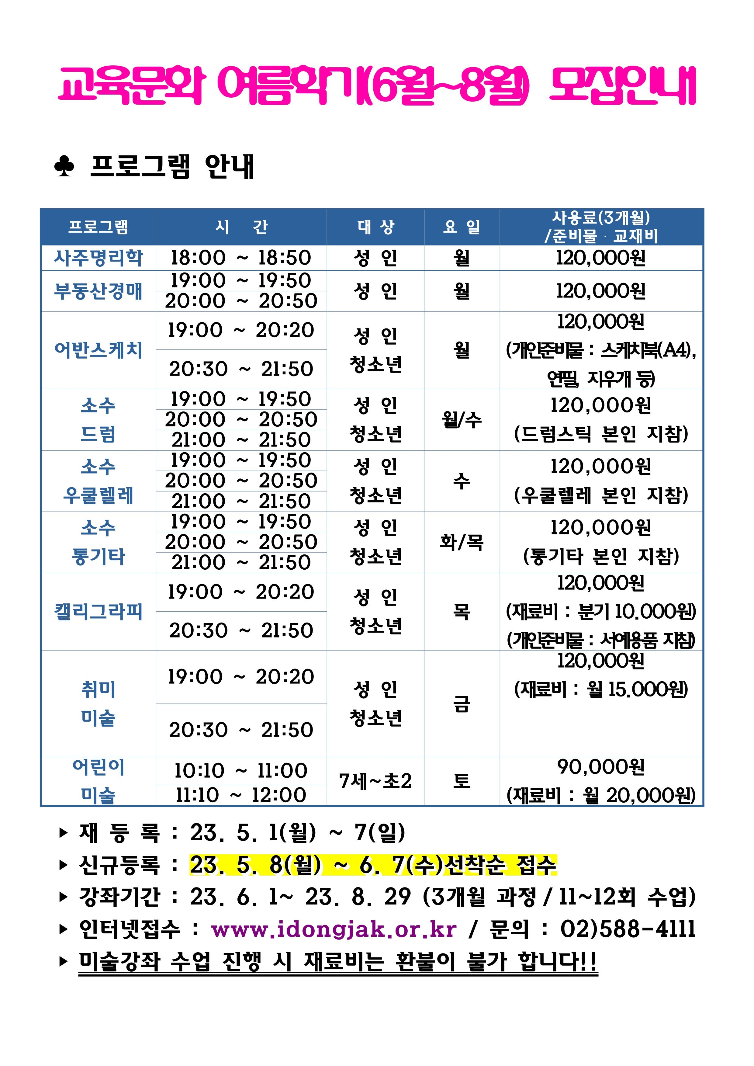 사당문화회관 사당문화회관 교육문화 여름학기(6~8월) 프로그램 안내 작성자 동작구민체육센터 작성일 2023년 5월 2일 14시 34분 59초 조회 790 여름학기 교육문화홍보1_page-0001.jpg [ Size : 783.53KB , Down : 370 ] 미리보기 다운로드 2023 여름학기 홍보물(a0)최종.jpg [ Size : 1.81MB , Down : 333 ] 미리보기 다운로드 목록보기