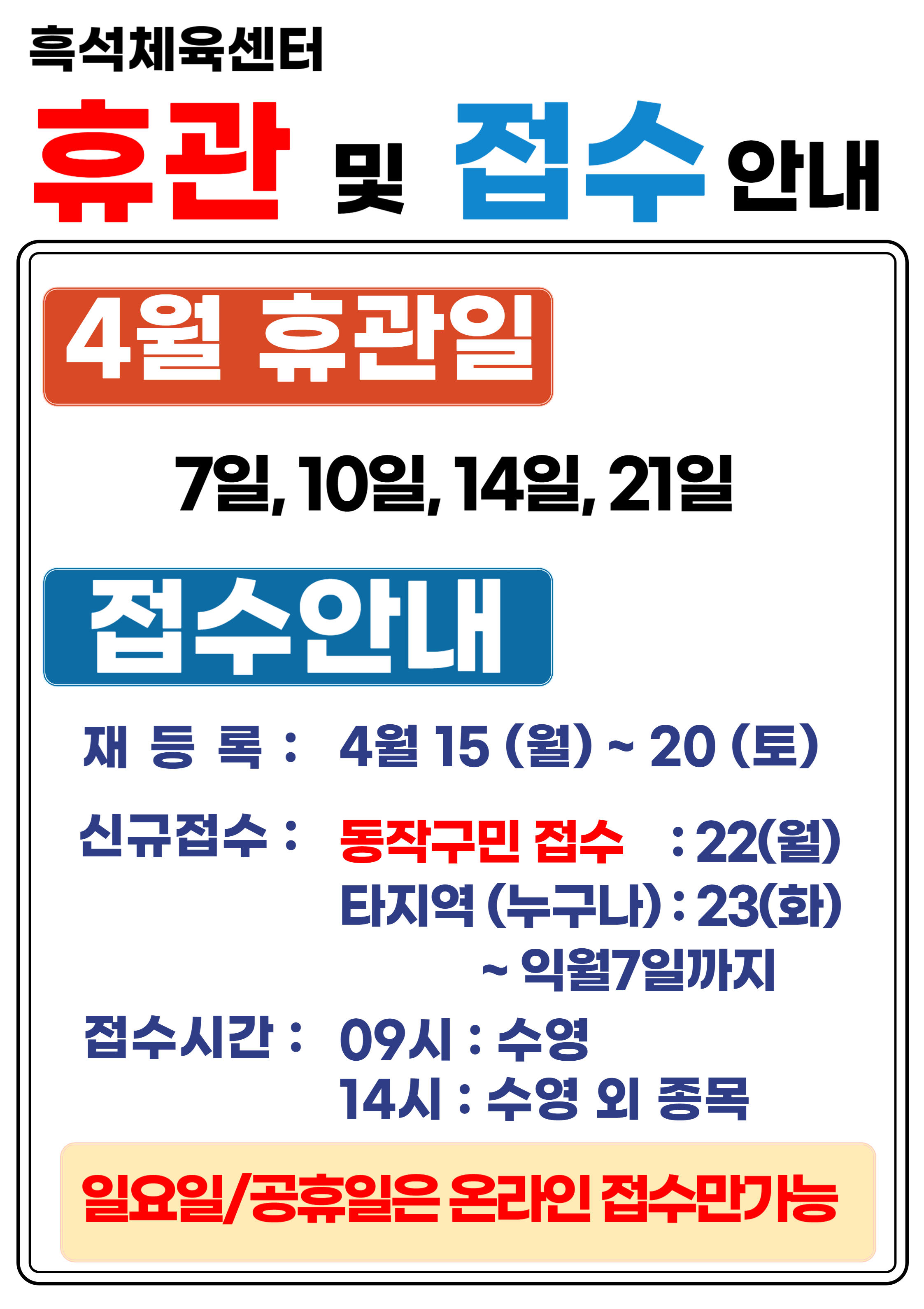 흑석체육센터 흑석체육센터 4월 휴관 및 접수 안내 작성자 흑석체육문화센터 작성일 2024년 4월 8일 18시 0분 46초 조회 690 4월.jpg [ Size : 1.17MB , Down : 498 ] 미리보기 다운로드 목록보기