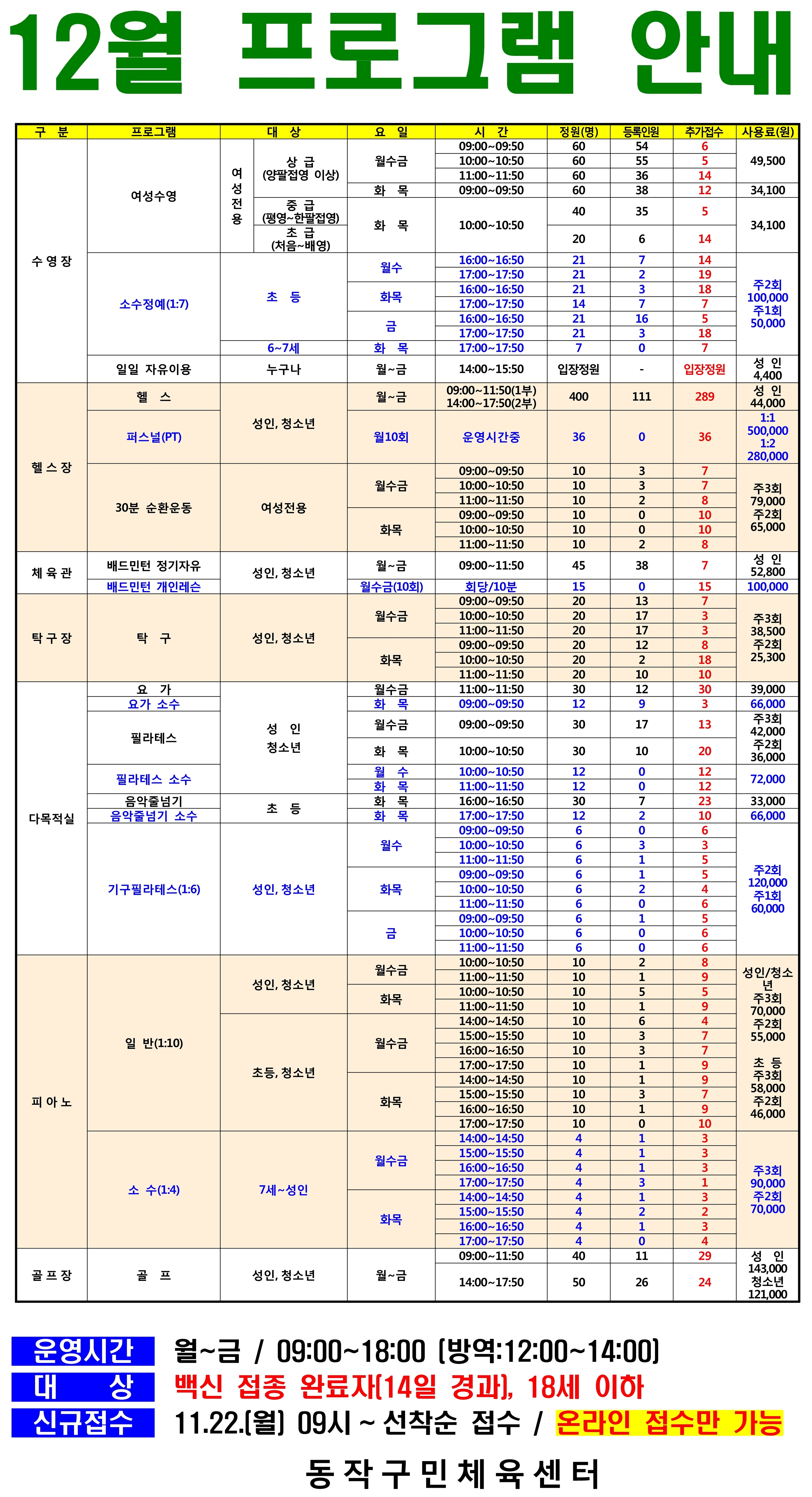 동작구민체육센터 동작구민체육센터 12월 프로그램 안내 작성자 사당문화회관 작성일 2021년 11월 19일 16시 57분 0초 조회 1,045 12월 프로그램 안내.jpg [ Size : 2.99MB , Down : 1,455 ] 미리보기 다운로드 목록보기