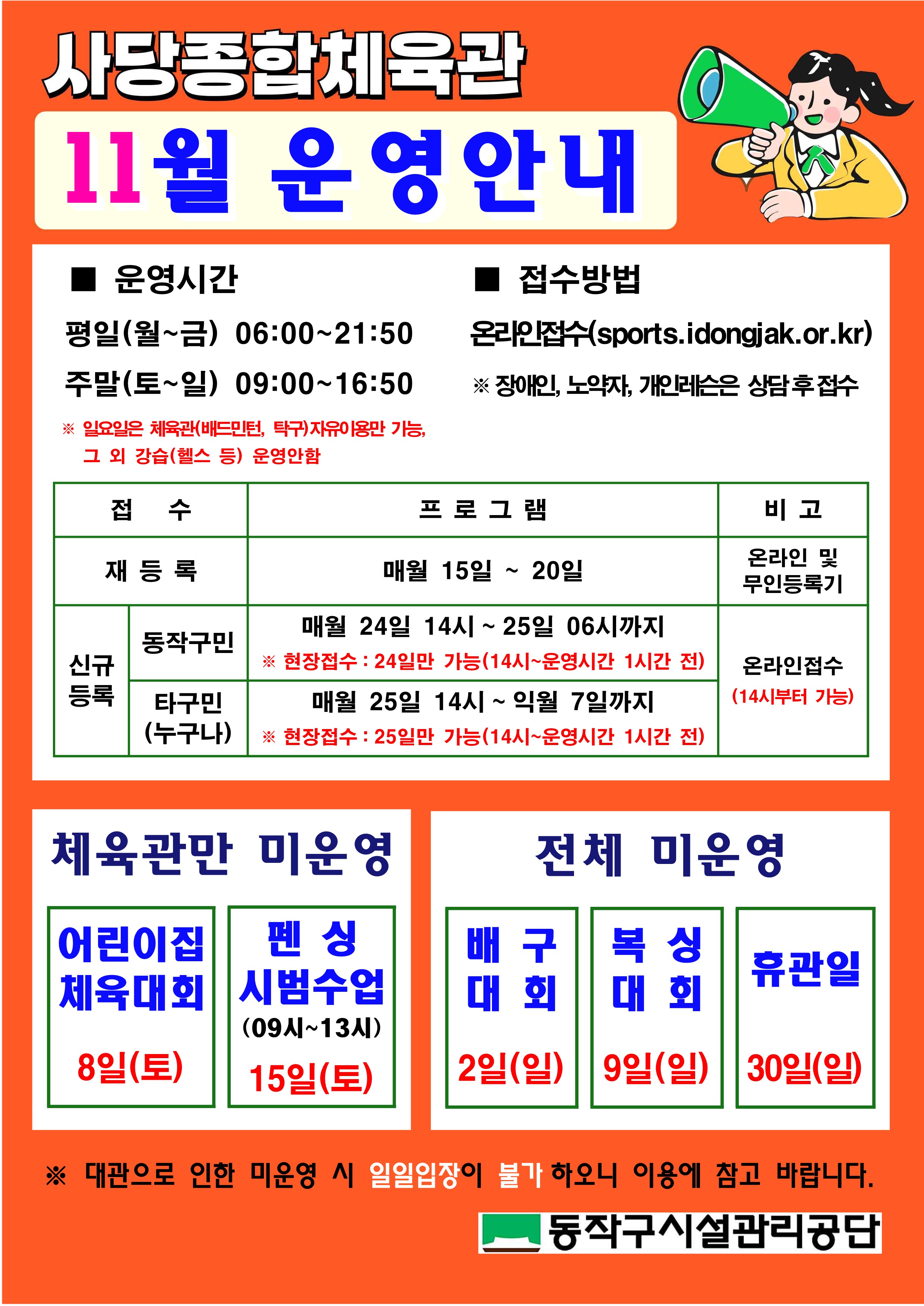 사당종합체육관 사당종합체육관 11월 운영 및 휴관안내 작성자 동작구민체육센터 작성일 2025년 10월 24일 16시 46분 39초 조회 343 11월운영안내_1.jpg [ Size : 1.05MB , Down : 272 ] 미리보기 다운로드 목록보기