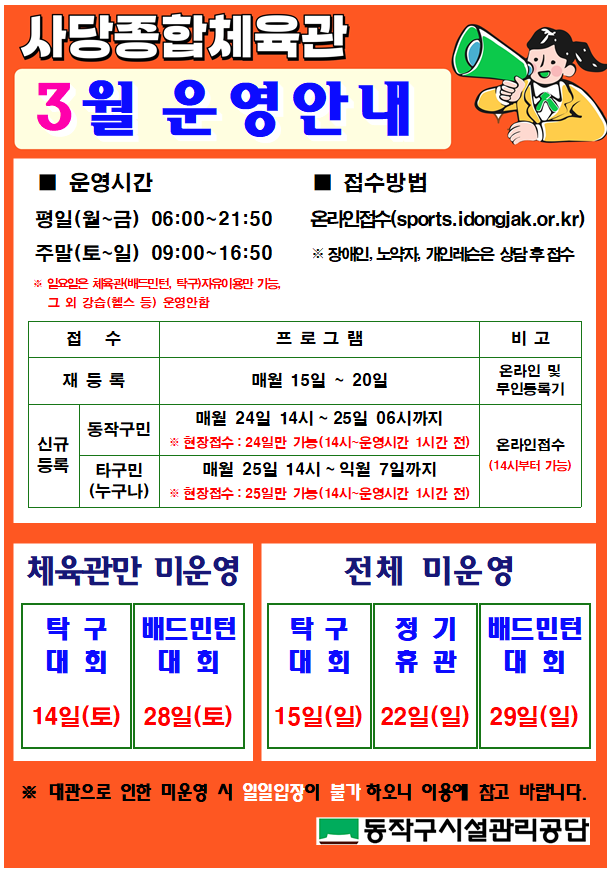 사당종합체육관 사당종합체육관 3월 운영 및 휴관안내 작성자 동작구민체육센터 작성일 2026년 2월 26일 12시 54분 17초 조회 43 KakaoTalk_20260225_113620800.png [ Size : 97.83KB , Down : 35 ] 미리보기 다운로드 목록보기