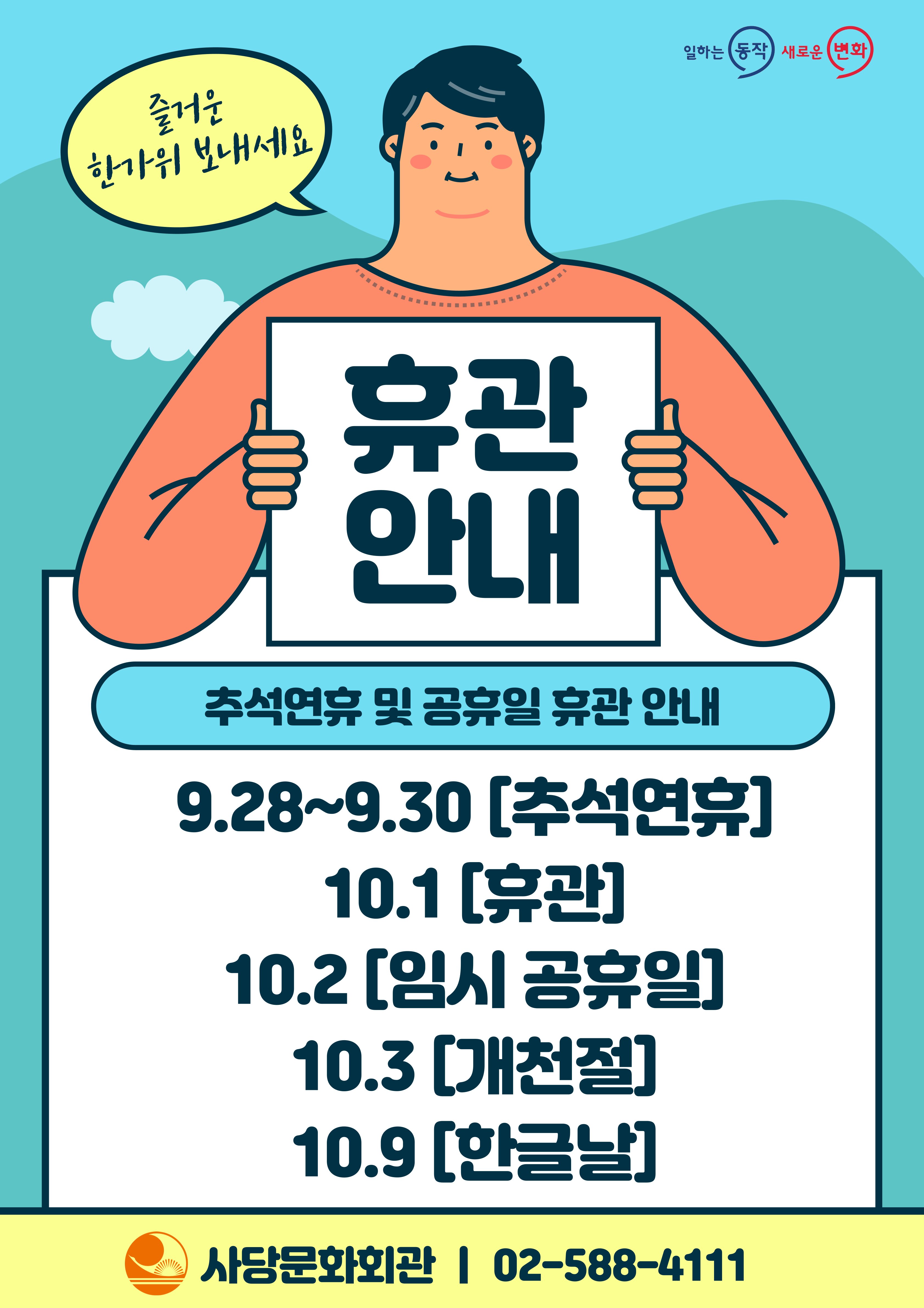 사당문화회관 사당문화회관 9~10월 휴관 안내 작성자 동작구민체육센터 작성일 2023년 9월 20일 14시 31분 51초 조회 852 휴관안내.jpg [ Size : 850.12KB , Down : 1,081 ] 미리보기 다운로드 목록보기