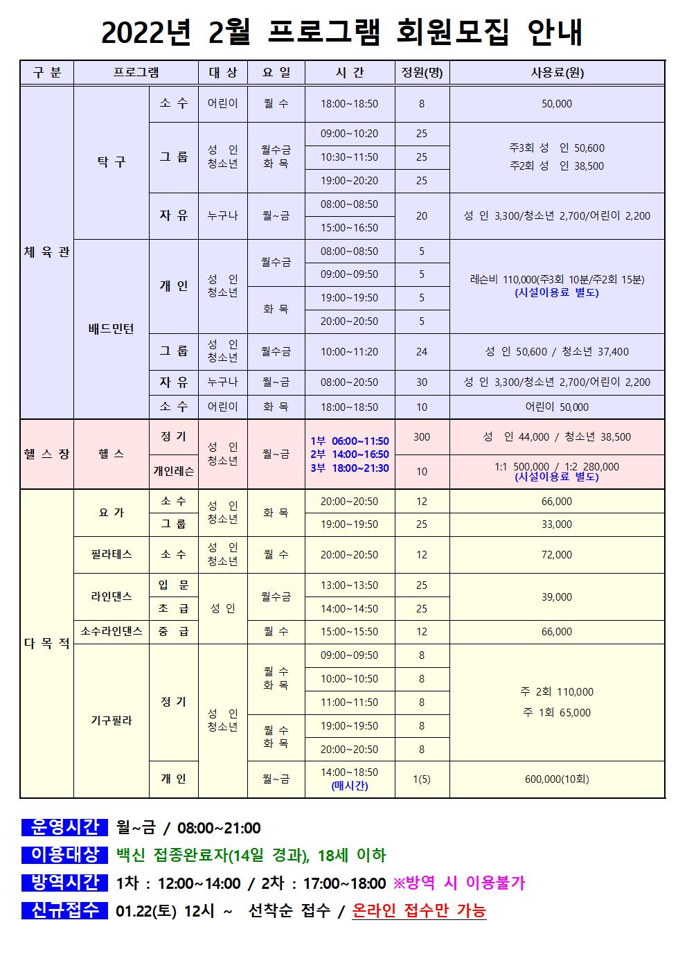 사당종합체육관 사당종합체육관 2월 프로그램 안내 작성자 동작구민체육센터 작성일 2022년 1월 10일 12시 37분 8초 조회 915 사당종합체육관 2022년 2월 프로그램 회원모집 안내(최최최종)001.jpg [ Size : 196.25KB , Down : 411 ] 미리보기 다운로드 목록보기