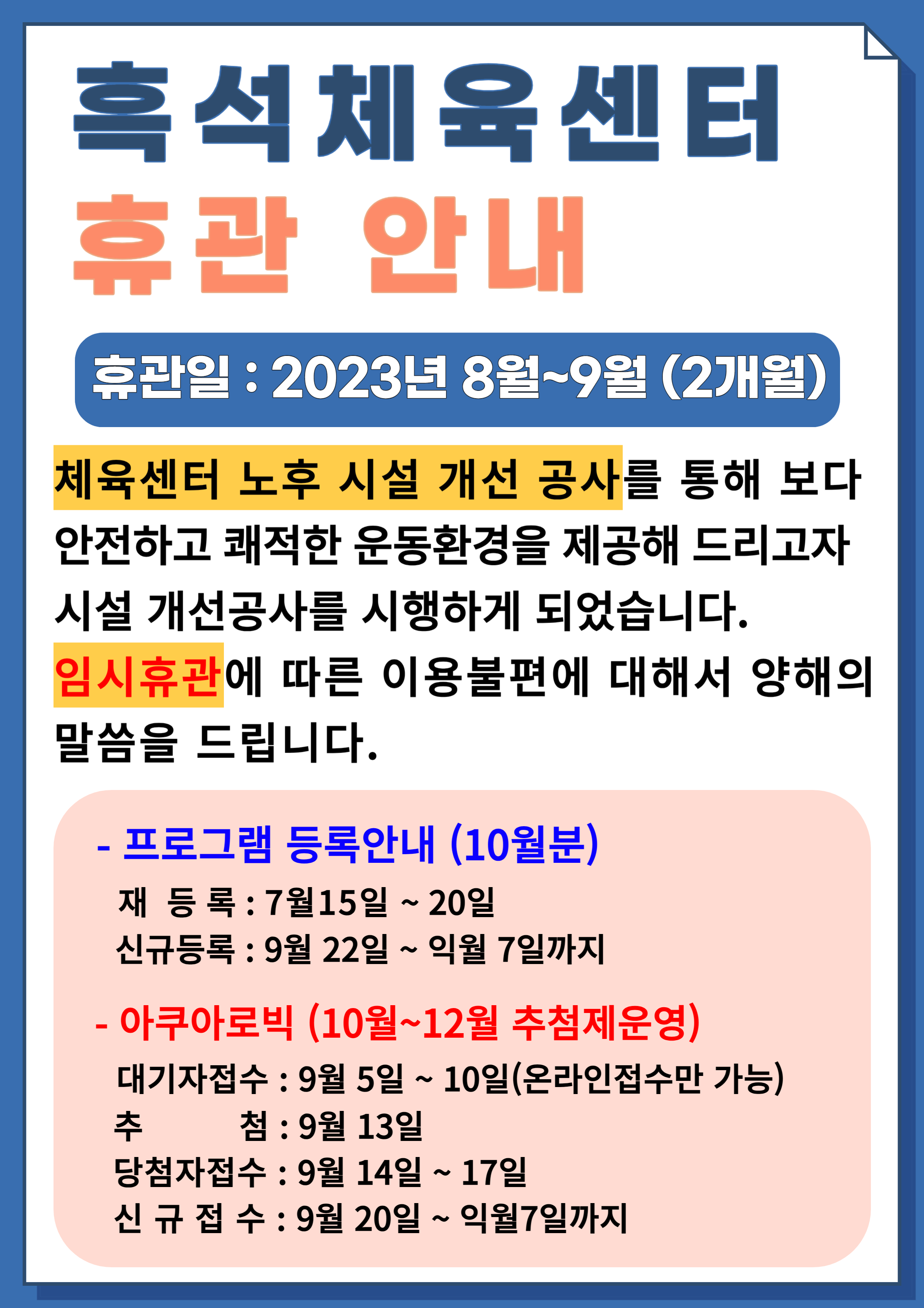 흑석체육센터 흑석체육센터 시설개선 공사관련 휴관 안내 작성자 흑석체육문화센터 작성일 2023년 7월 5일 14시 57분 6초 조회 1,246 휴관안내-팝업.jpg [ Size : 1.52MB , Down : 1,313 ] 미리보기 다운로드 목록보기