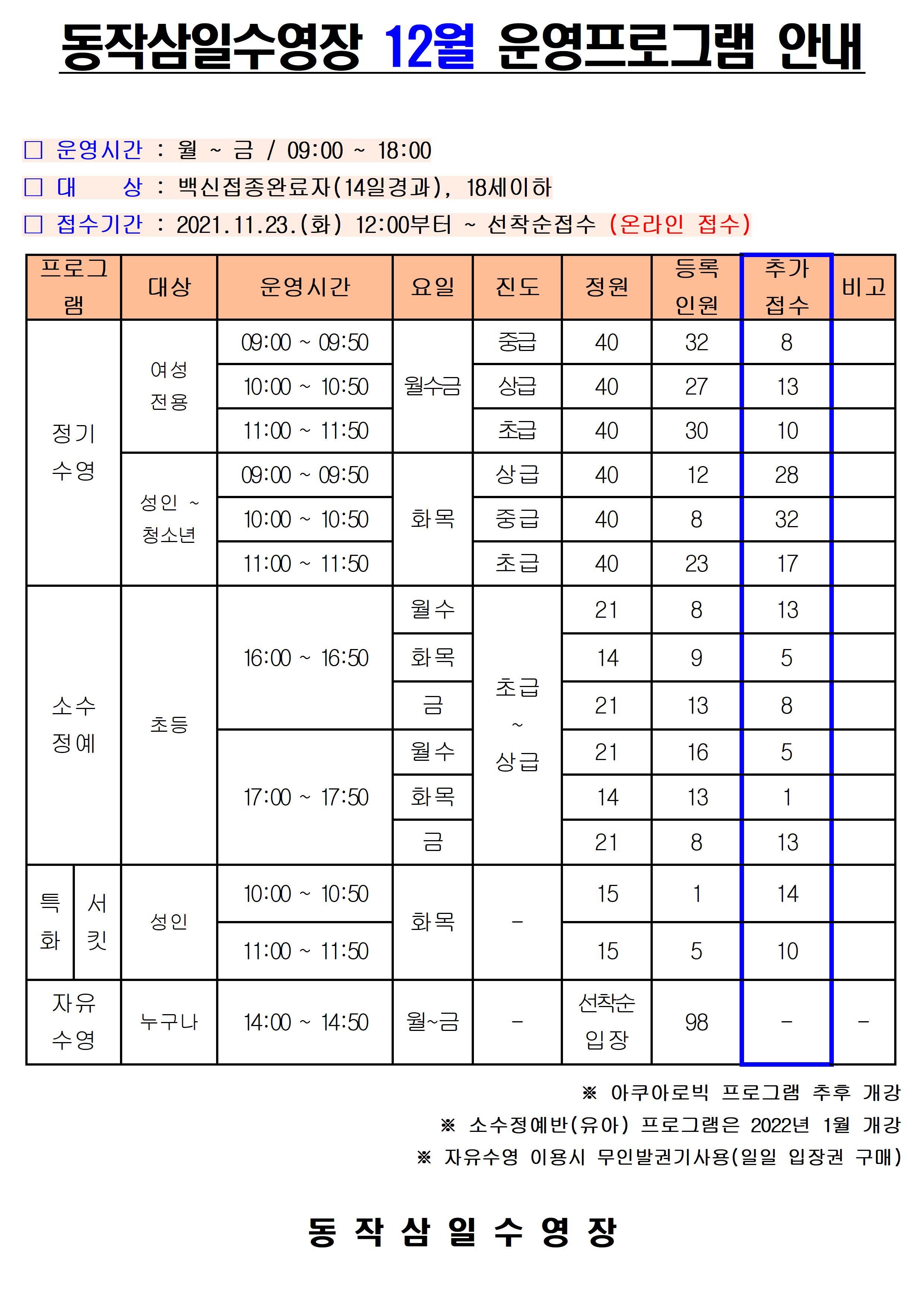 삼일수영장 동작삼일수영장 12월 운영 프로그램 안내 작성자 사당문화회관 작성일 2021년 11월 19일 12시 2분 22초 조회 937 12월 운영프로그램 잔여001.jpg [ Size : 629.17KB , Down : 815 ] 미리보기 다운로드 목록보기