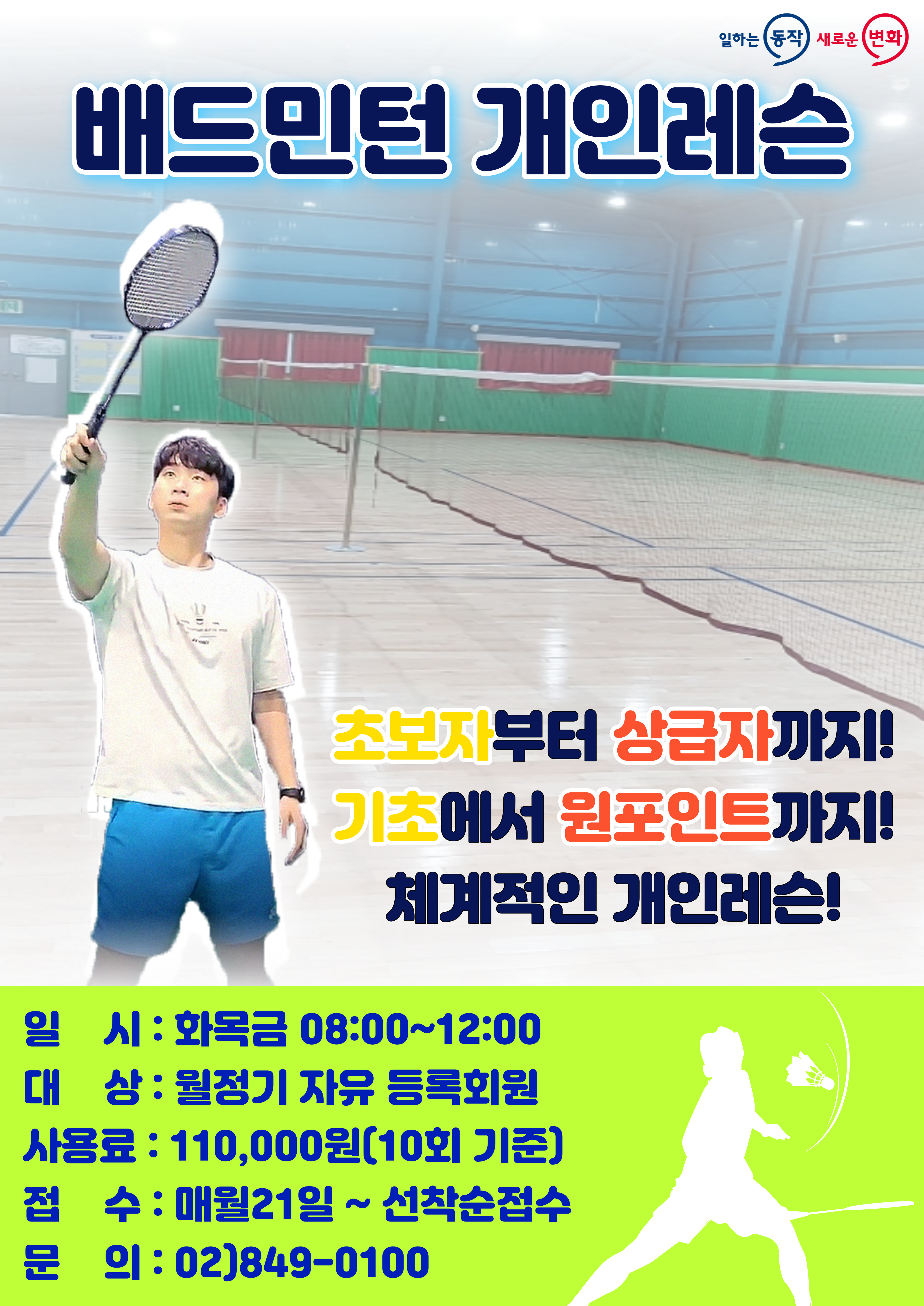 동작구민체육센터 동작구민체육센터 배드민턴 개인레슨 안내 작성자 사당문화회관 작성일 2023년 9월 15일 14시 5분 36초 조회 833 배드민턴-개인레슨-001 (1).jpg [ Size : 2MB , Down : 569 ] 미리보기 다운로드 목록보기