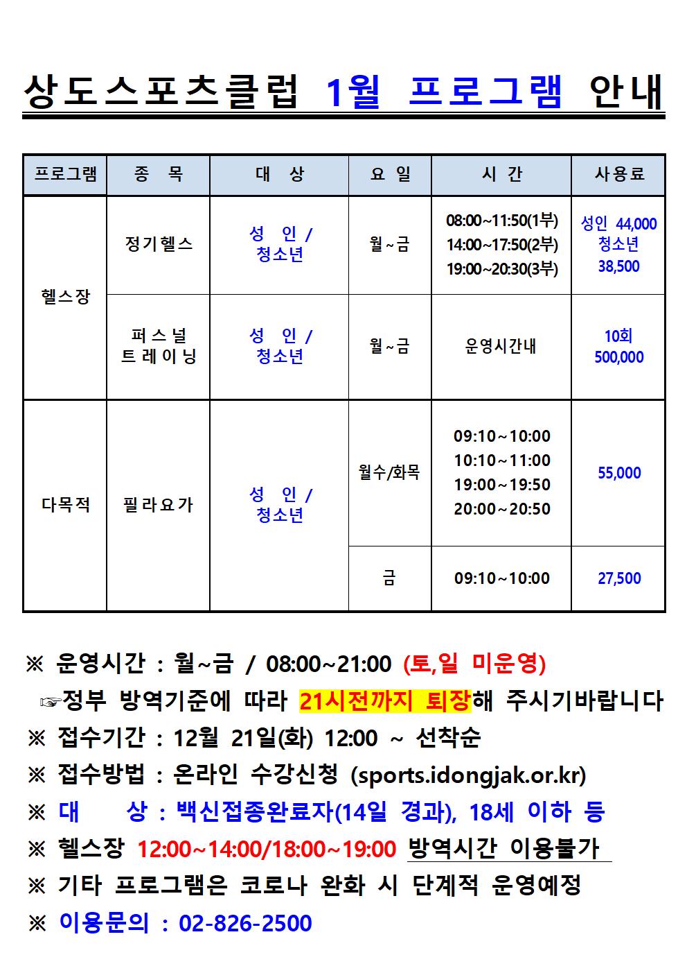 상도스포츠클럽 상도스포츠클럽 1월 프로그램 안내 작성자 동작구민체육센터 작성일 2021년 12월 17일 17시 12분 22초 조회 758 1월프로그램(상도)8시30.jpg [ Size : 180.17KB , Down : 408 ] 미리보기 다운로드 목록보기