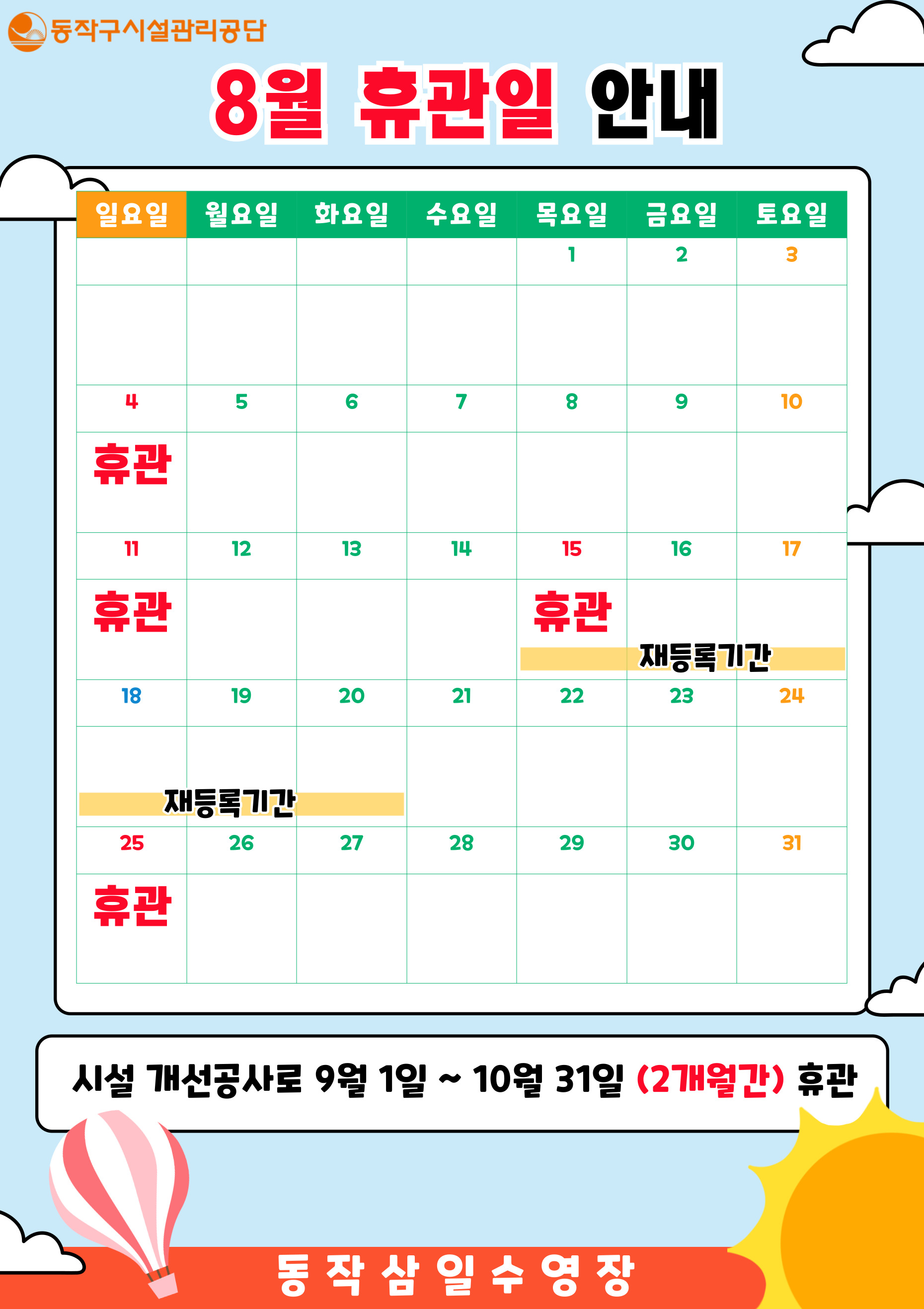삼일수영장 동작삼일수영장 8월 휴관일 안내 작성자 사당문화회관 작성일 2024년 7월 31일 14시 55분 26초 조회 688 8월 휴관일 안내.jpg [ Size : 503.71KB , Down : 508 ] 미리보기 다운로드 목록보기