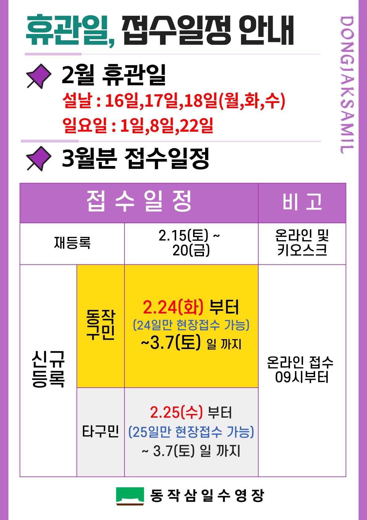 삼일수영장 동작삼일수영장 2월 휴관일 및 3월 접수일정 안내 작성자 동작구민체육센터 작성일 2026년 1월 31일 9시 0분 50초 조회 70 휴관일 및 접수 일정 안내.jpg [ Size : 182.99KB , Down : 62 ] 미리보기 다운로드 목록보기