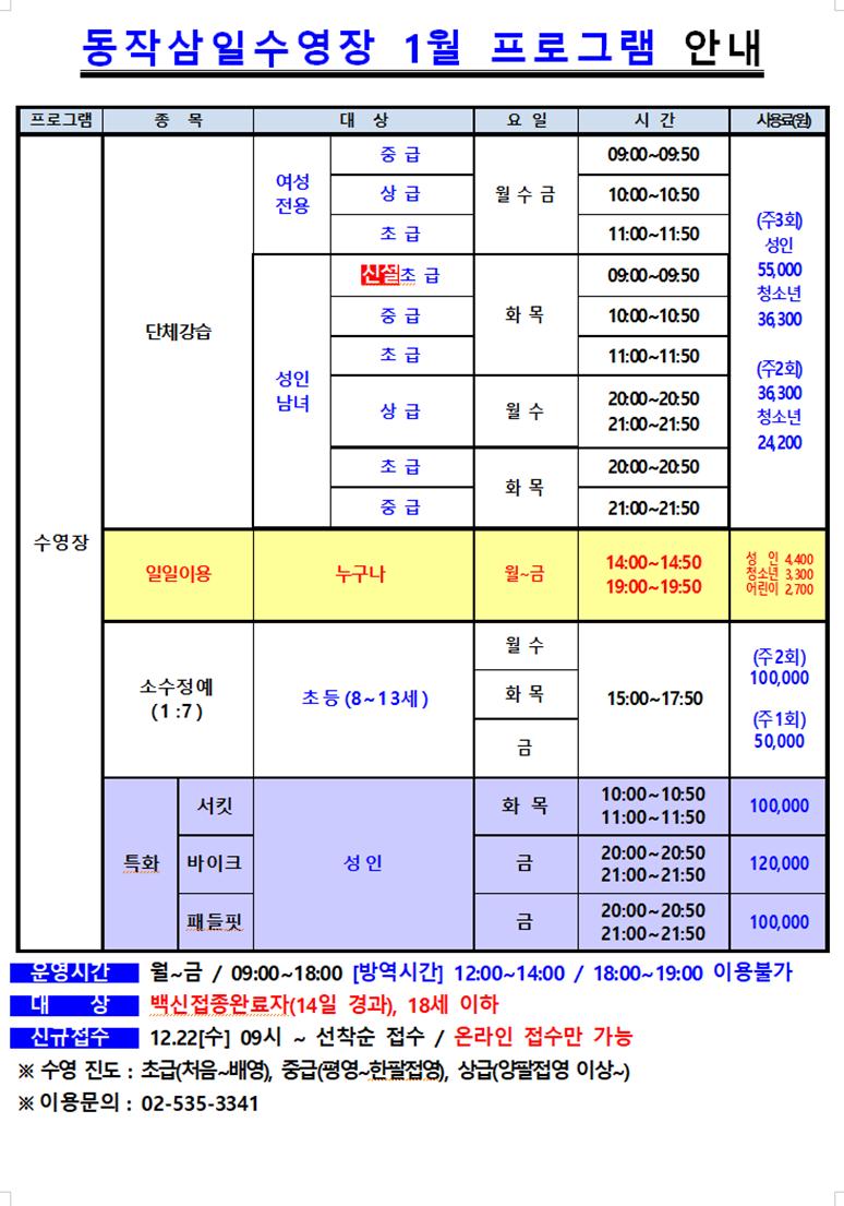 삼일수영장 동작삼일수영장 1월 프로그램 안내 작성자 삼일수영장 작성일 2021년 12월 14일 17시 23분 15초 조회 872 1월 프로그램.jpg [ Size : 127.09KB , Down : 501 ] 미리보기 다운로드 목록보기