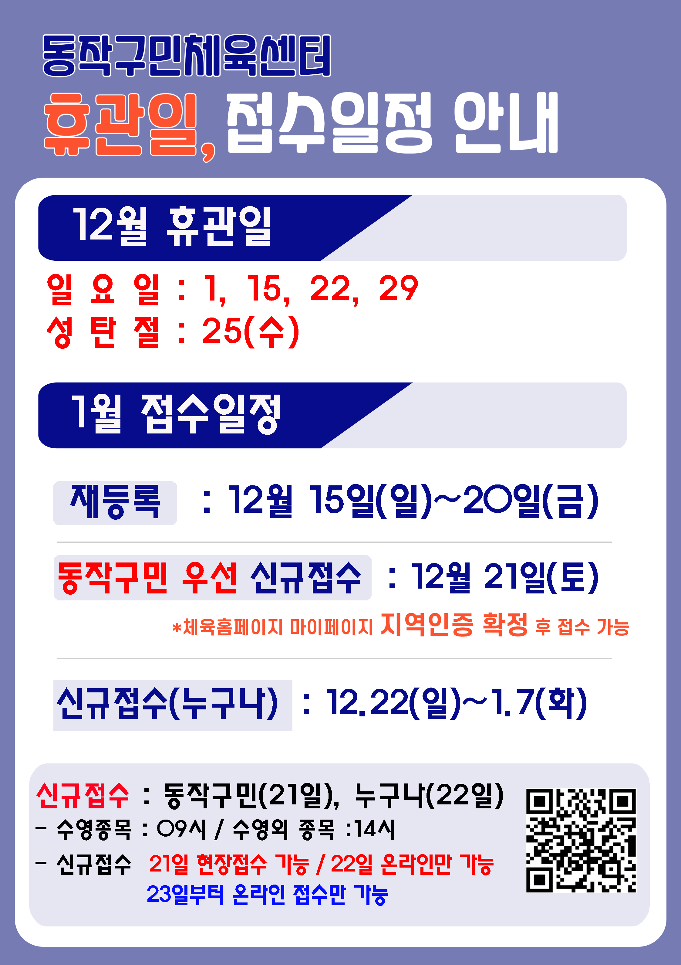 동작구민체육센터 동작구민체육센터 12 휴관안내 및 1월 접수일정안내 작성자 동작구민체육센터 작성일 2024년 12월 2일 14시 19분 49초 조회 941 휴관일안내(2024)12월.JPG [ Size : 1.74MB , Down : 225 ] 미리보기 다운로드 목록보기
