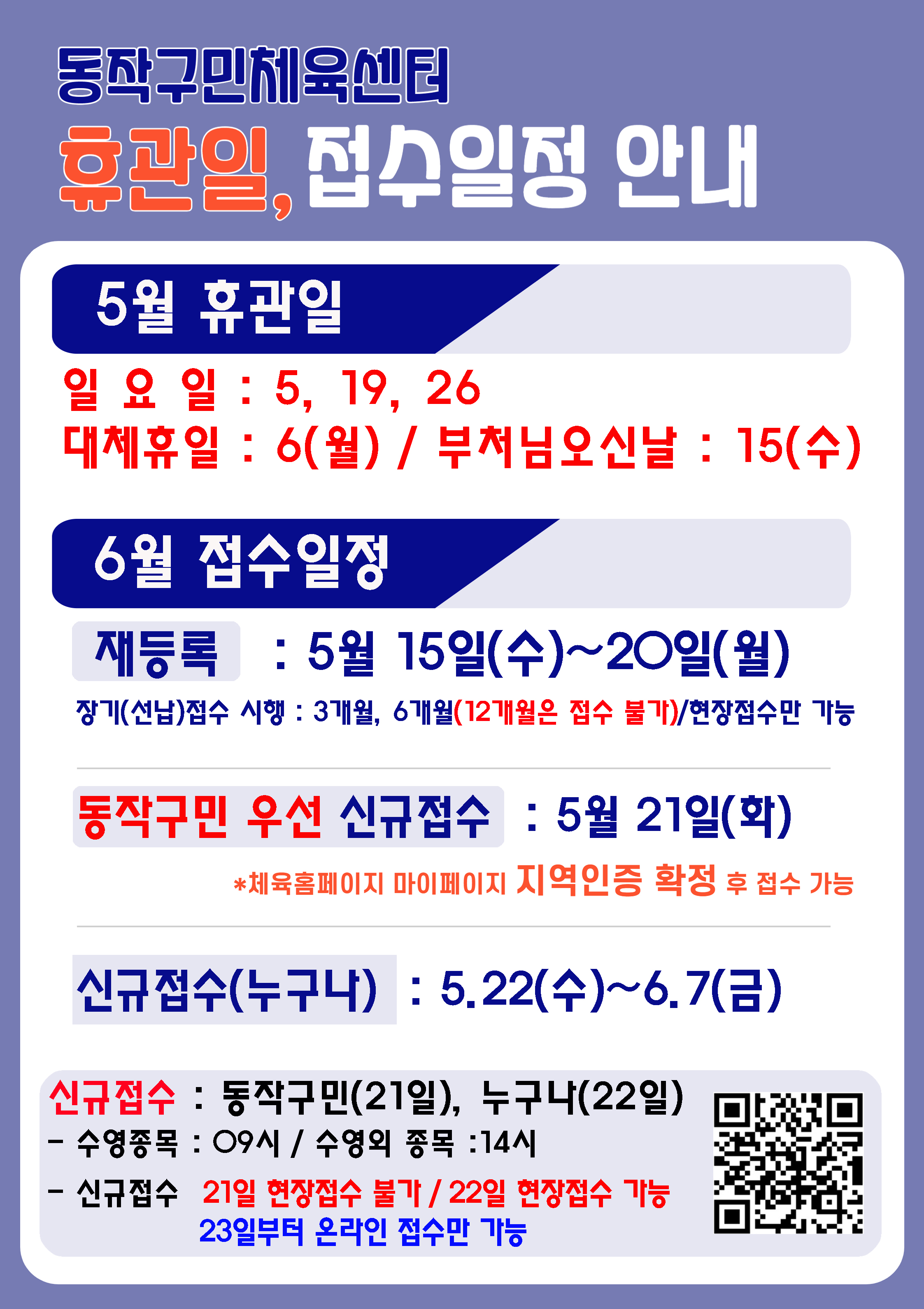 동작구민체육센터 동작구민체육센터 5월 휴관일 및 6월 접수 안내 작성자 동작구민체육센터 작성일 2024년 5월 13일 19시 59분 37초 조회 821 휴관일안내(2024) copy.JPG [ Size : 1.92MB , Down : 242 ] 미리보기 다운로드 목록보기