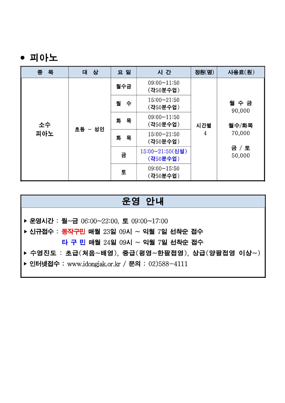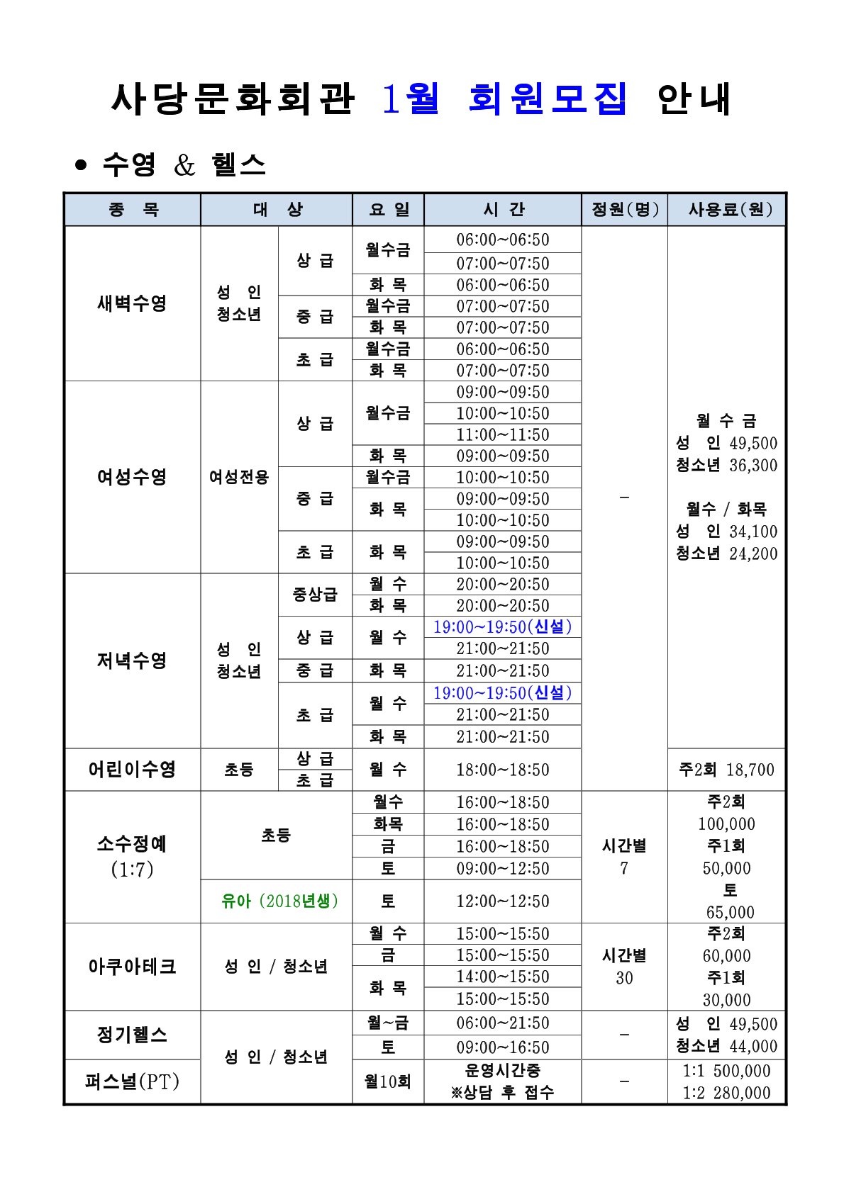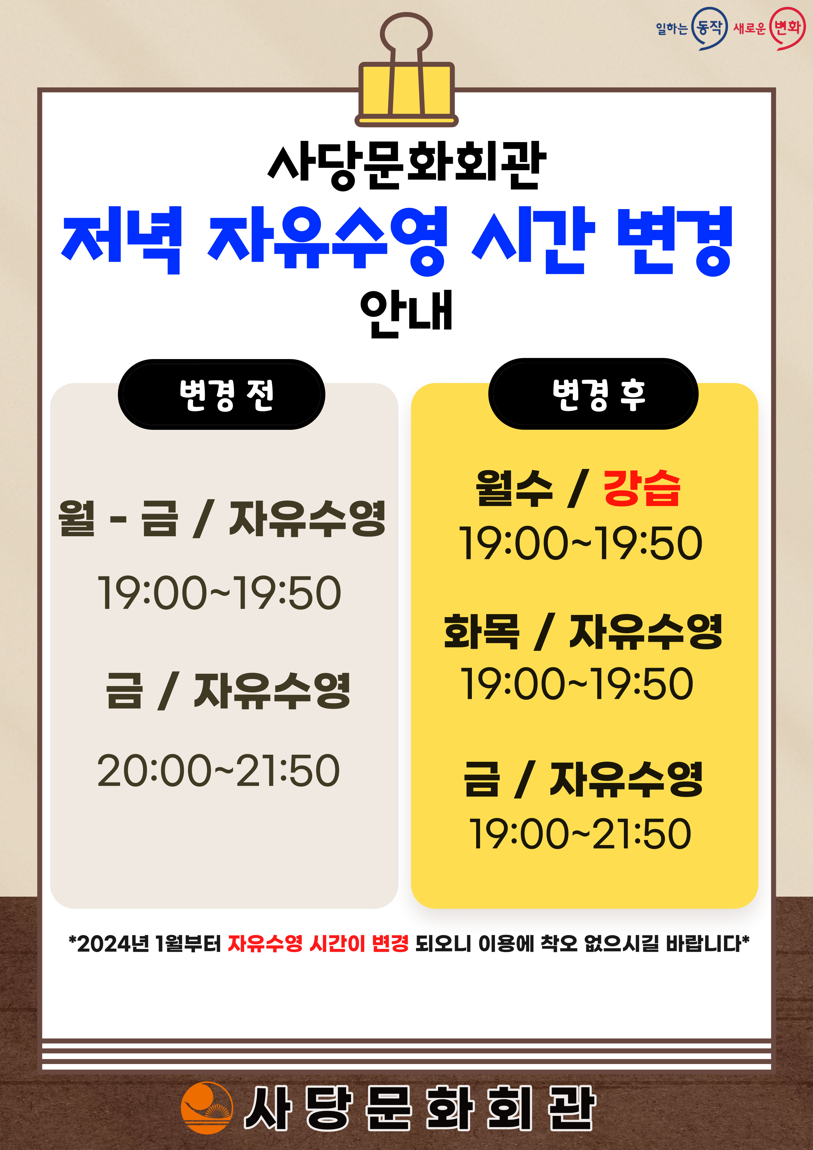 사당문화회관 사당문화회관 1월 프로그램 및 저녁 자유수영 시간 변경 안내 작성자 동작구민체육센터 작성일 2023년 12월 15일 16시 46분 23초 조회 1,626 0001.jpg [ Size : 264KB , Down : 1,685 ] 미리보기 다운로드 0002.jpg [ Size : 200.26KB , Down : 1,621 ] 미리보기 다운로드 0003.jpg [ Size : 152.36KB , Down : 318 ] 미리보기 다운로드 자유수영 변경 홍보물.jpg [ Size : 1.08MB , Down : 1,693 ] 미리보기 다운로드 수업-변경-002 (3).jpg [ Size : 964.9KB , Down : 875 ] 미리보기 다운로드 목록보기