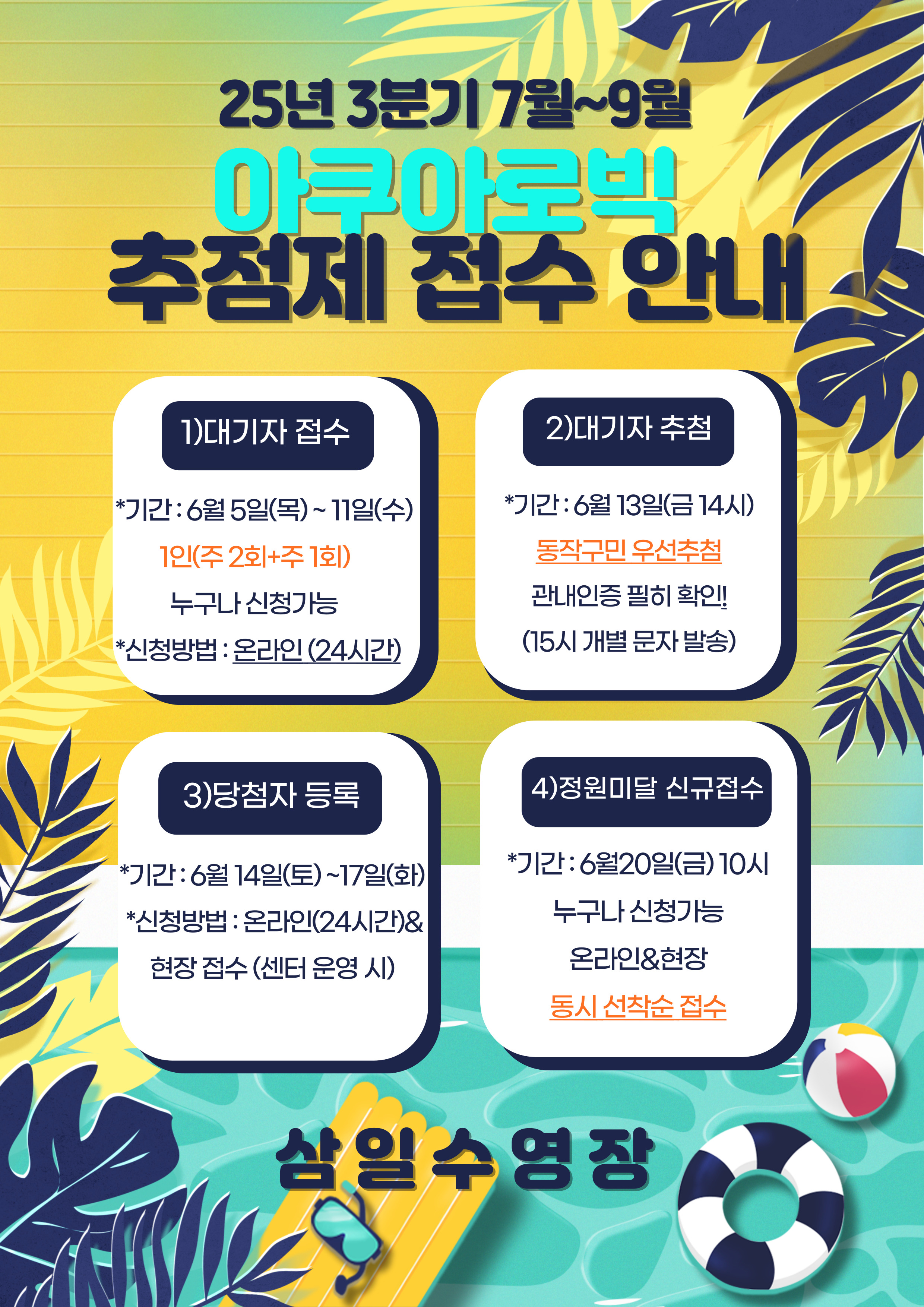 삼일수영장 동작삼일수영장 3분기(7월~9월) 아쿠아로빅 접수일정 안내 작성자 동작구민체육센터 작성일 2025년 5월 26일 13시 54분 42초 조회 428 아쿠아 홍보물.jpg [ Size : 1.83MB , Down : 328 ] 미리보기 다운로드 목록보기