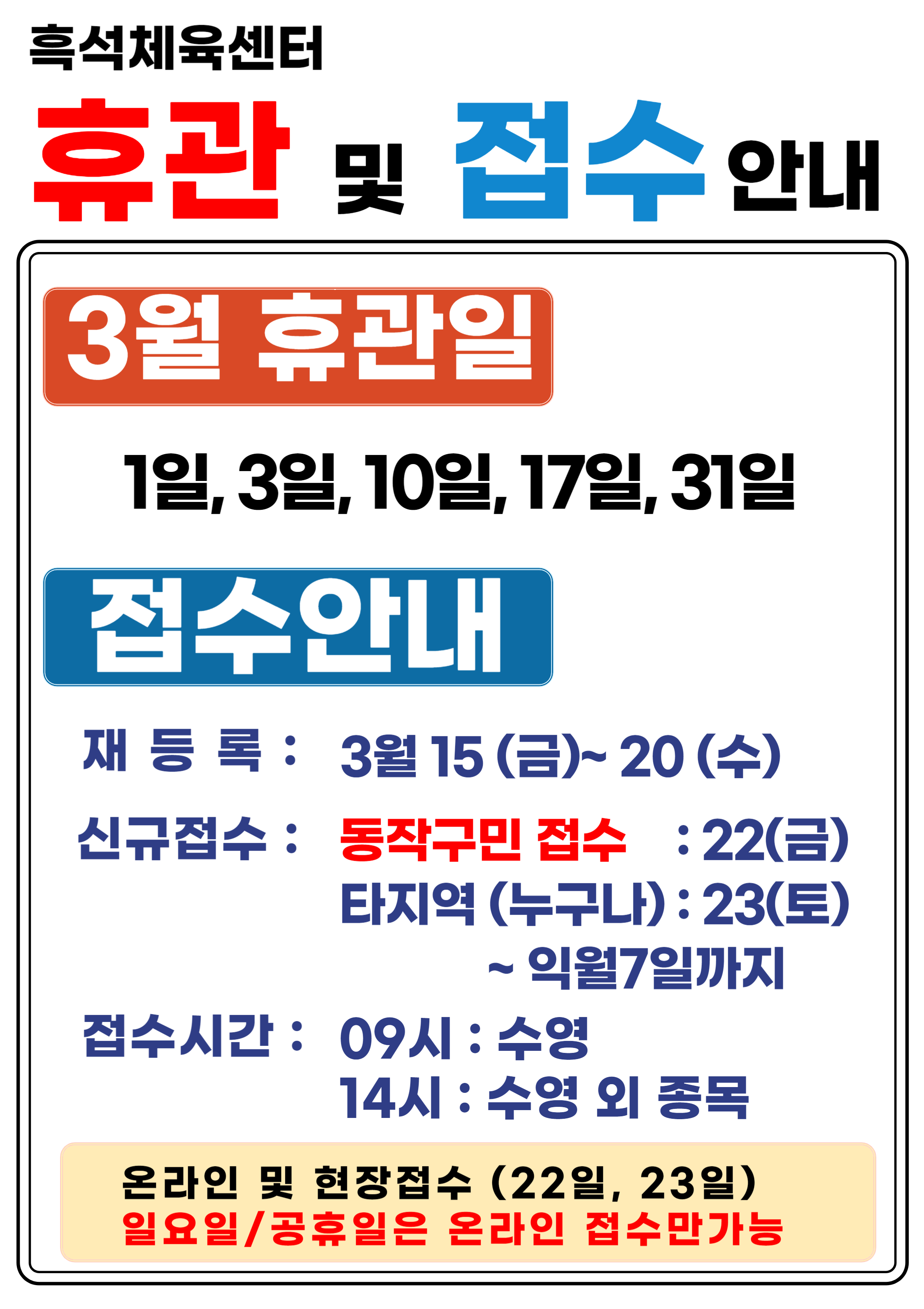 흑석체육센터 흑석체육센터 3월 휴관 및 접수 안내 작성자 흑석체육문화센터 작성일 2024년 2월 19일 14시 48분 50초 조회 813 3월 (2).jpg [ Size : 1.23MB , Down : 663 ] 미리보기 다운로드 목록보기
