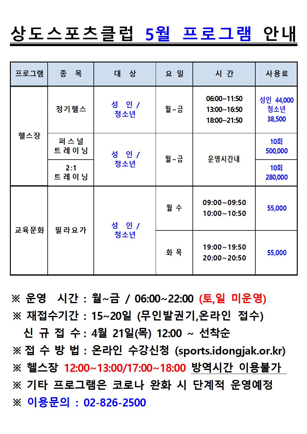 상도스포츠클럽 상도스포츠클럽 5월 프로그램 안내 작성자 상도스포츠클럽 작성일 2022년 4월 14일 13시 4분 7초 조회 797 5월프로그램안내(상도)001.jpg [ Size : 175KB , Down : 444 ] 미리보기 다운로드 목록보기