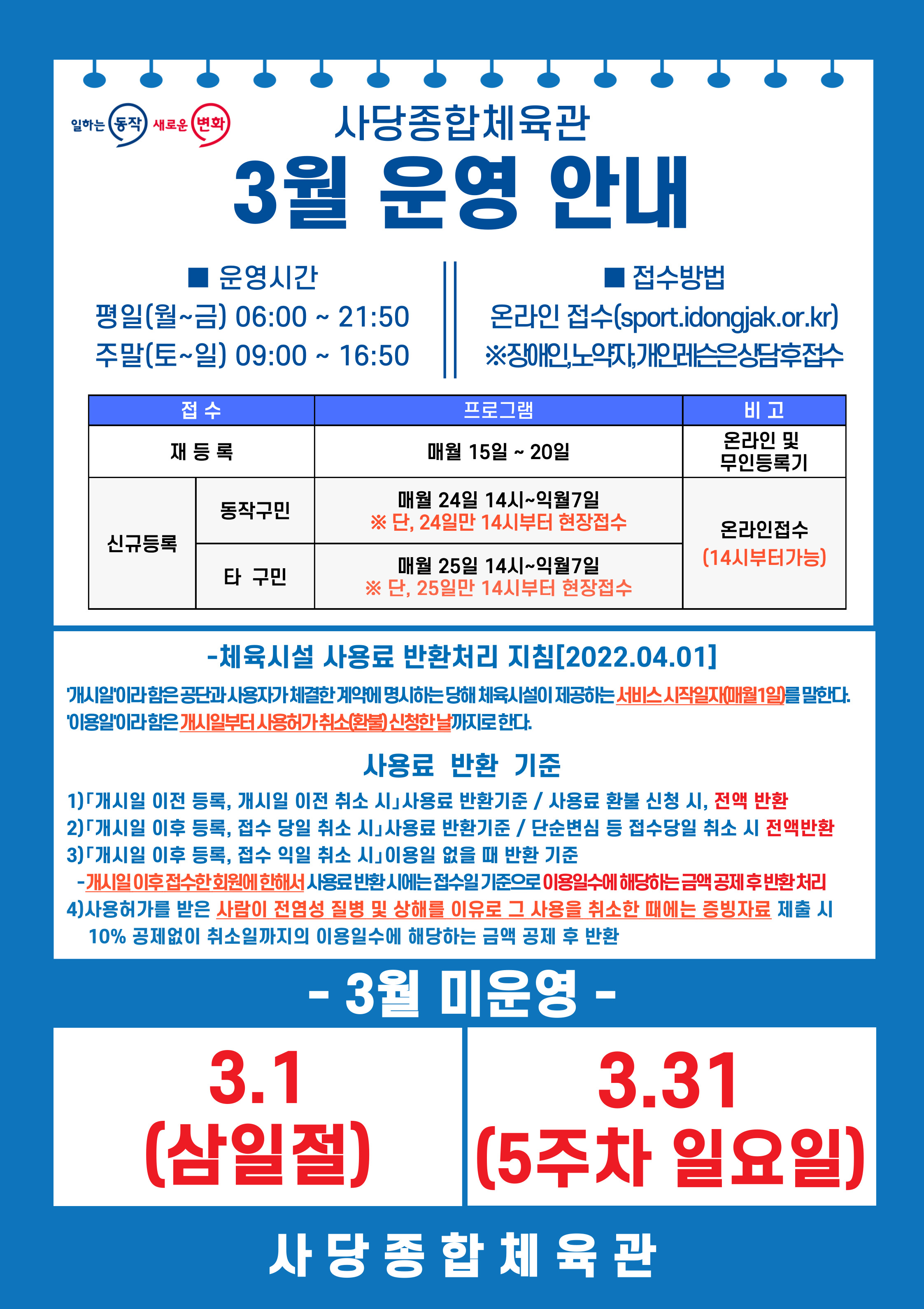 사당종합체육관 사당종합체육관 운영 및 휴관안내 작성자 동작구민체육센터 작성일 2024년 2월 15일 15시 45분 17초 조회 605 3월 운영안내.jpg [ Size : 1.22MB , Down : 441 ] 미리보기 다운로드 3월 운영.jpg [ Size : 418.46KB , Down : 421 ] 미리보기 다운로드 목록보기