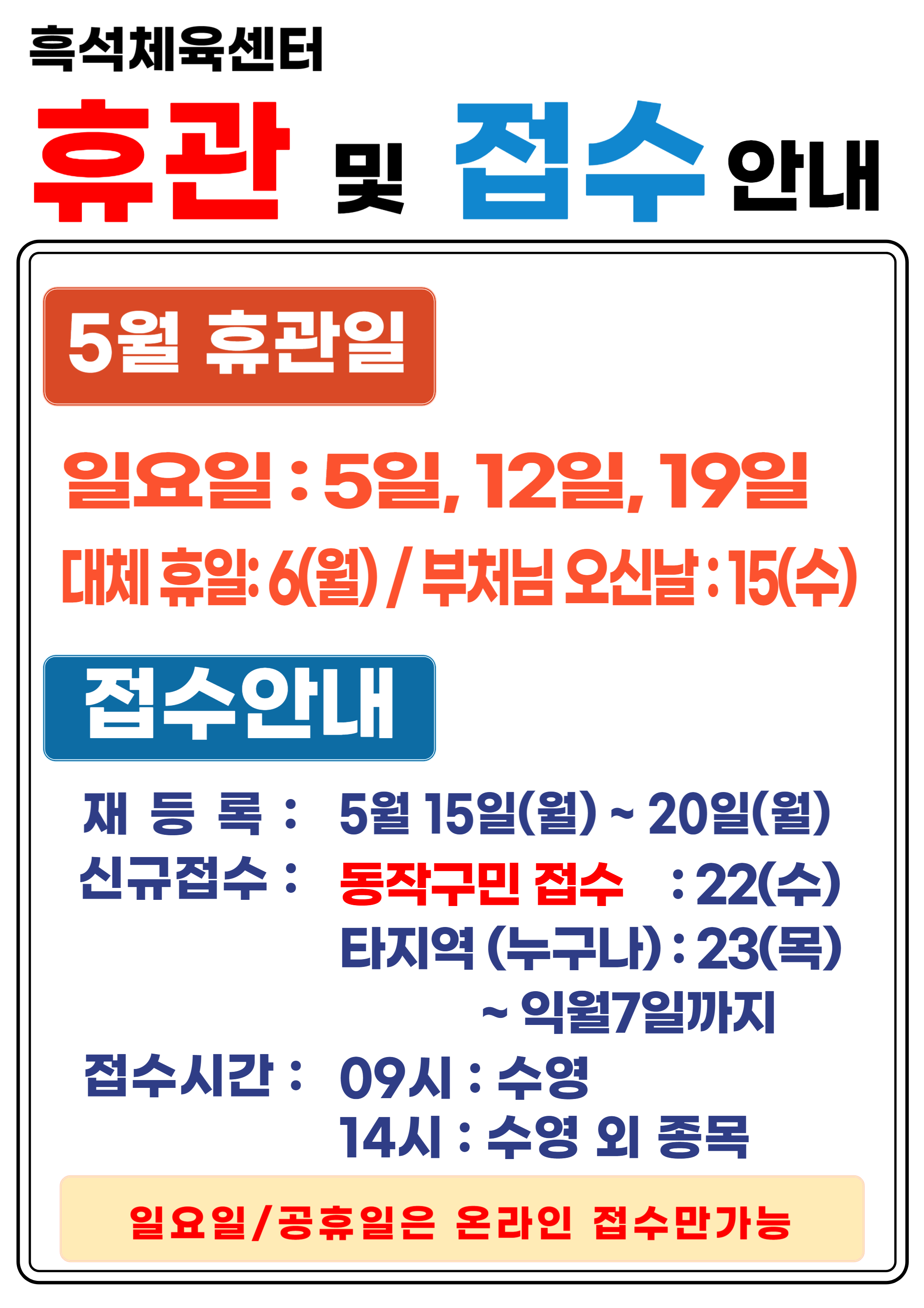흑석체육센터 흑석체육센터 5월 휴관 및 접수 안내 작성자 흑석체육문화센터 작성일 2024년 4월 18일 13시 36분 33초 조회 1,431 5월.jpg [ Size : 1.34MB , Down : 1,588 ] 미리보기 다운로드 목록보기