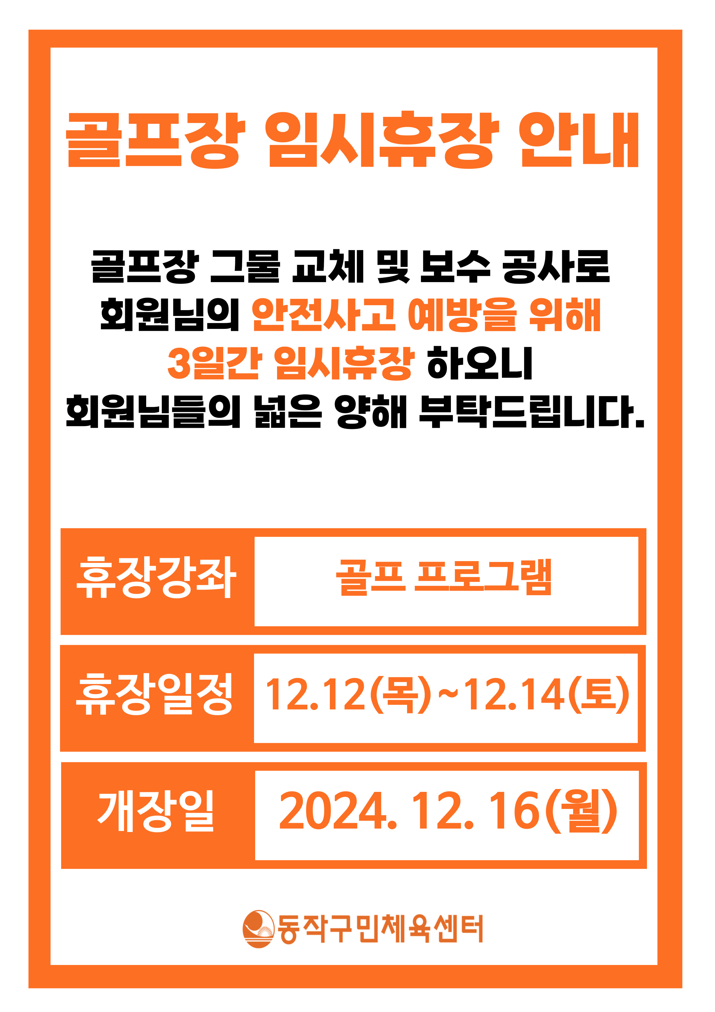 동작구민체육센터 동작구민체육센터 골프장 휴장 및 운영안내 작성자 동작구민체육센터 작성일 2024년 12월 11일 20시 45분 50초 조회 604 골프장휴장안내문.jpg [ Size : 716.52KB , Down : 419 ] 미리보기 다운로드 목록보기