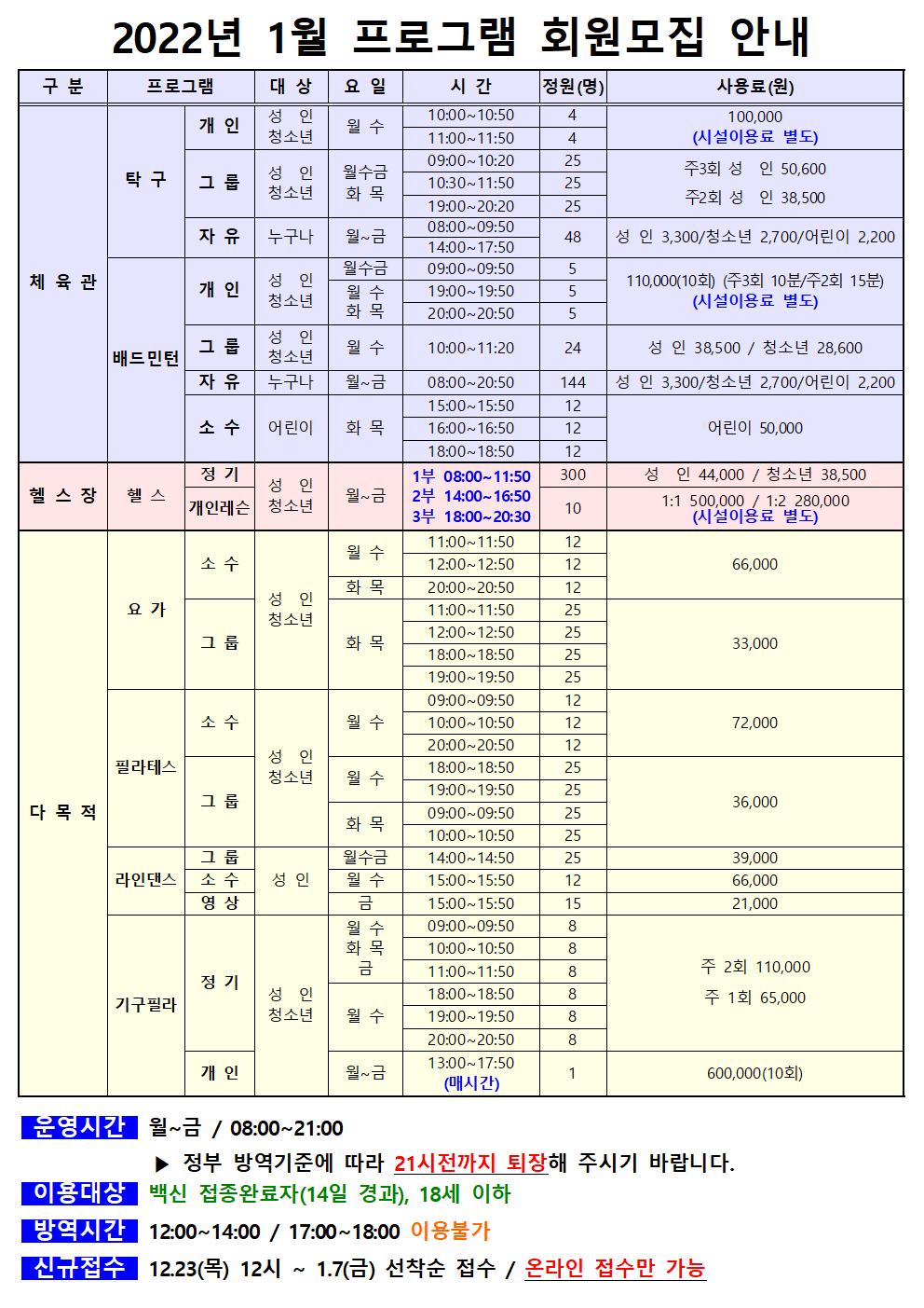 사당종합체육관 사당종합체육관 1월 회원모집 안내 작성자 동작구민체육센터 작성일 2021년 12월 14일 13시 51분 35초 조회 897 사당종합체육관 2022년 1월 프로그램 회원모집 안내(수정)001.jpg [ Size : 241.89KB , Down : 403 ] 미리보기 다운로드 목록보기