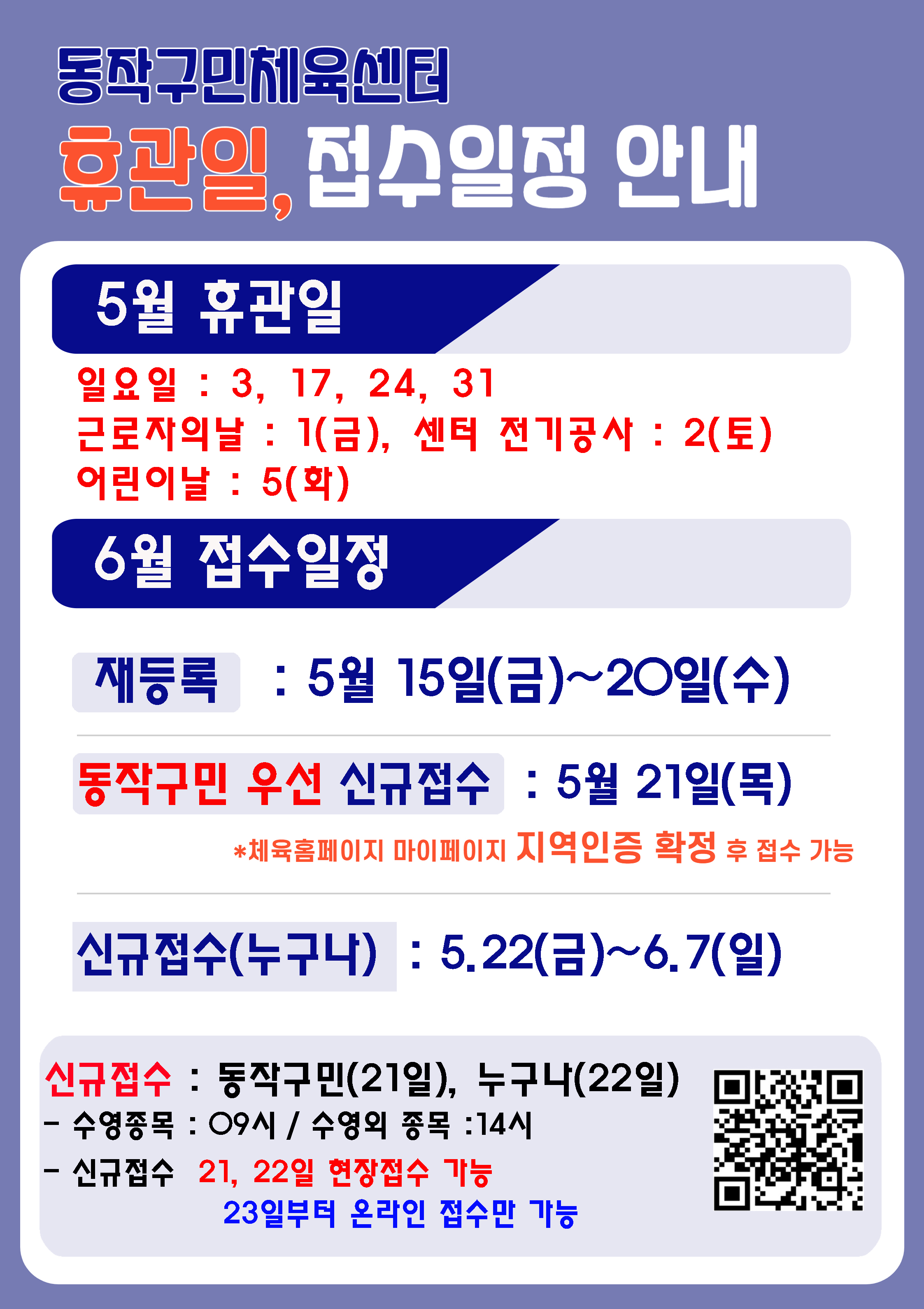 동작구민체육센터 동작구민체육센터 5월 휴관일 및 6월 접수일정 안내 작성자 동작구민체육센터 작성일 2026년 4월 29일 15시 28분 5초 조회 65 5월휴관일.JPG [ Size : 1.76MB , Down : 10 ] 미리보기 다운로드 목록보기
