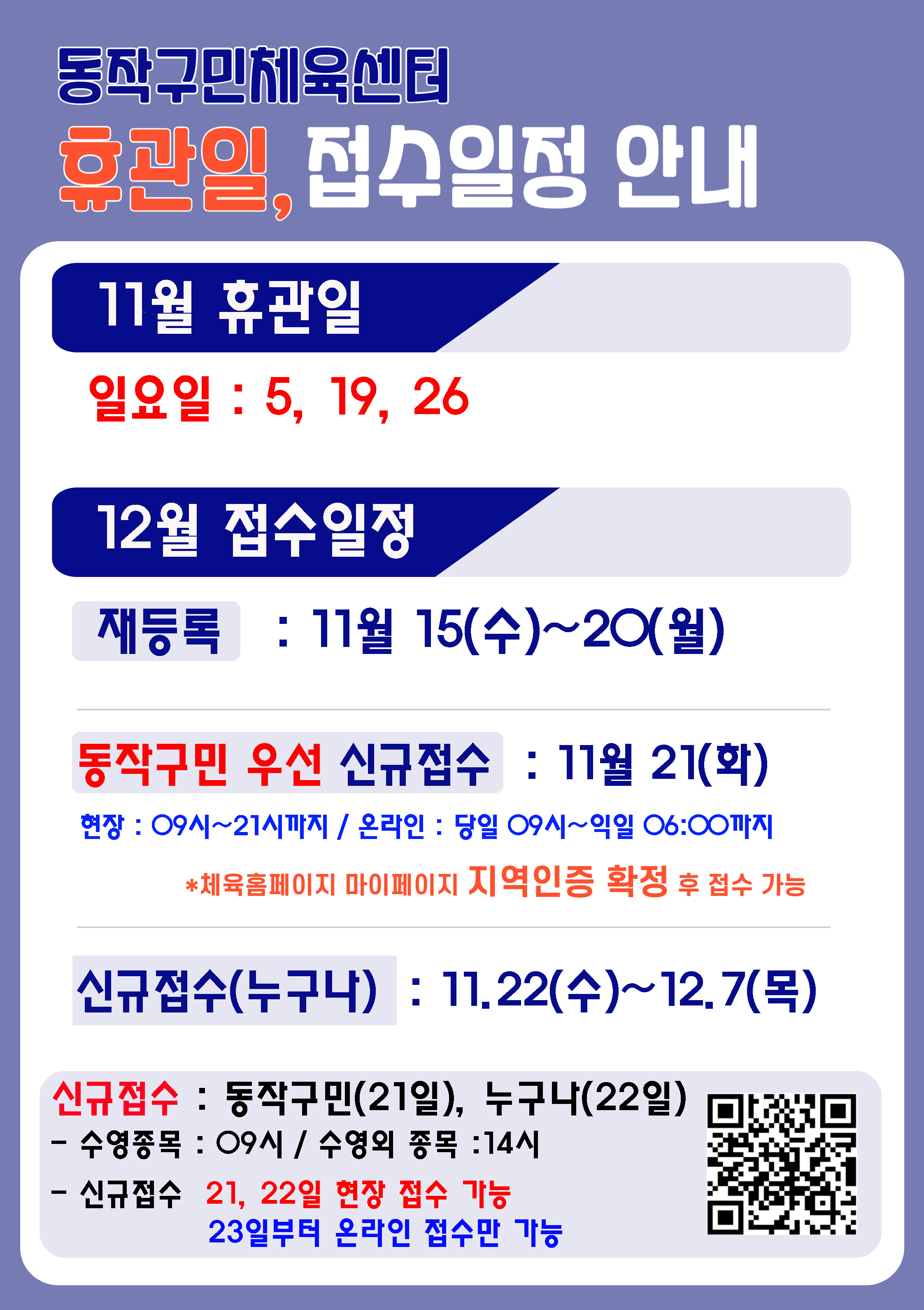 동작구민체육센터 동작구민체육센터 11월 휴관 및 접수 일정 안내 작성자 동작구민체육센터 작성일 2023년 10월 31일 13시 50분 38초 조회 816 휴관일안내(2023)11월 copy.JPG [ Size : 1.72MB , Down : 1,058 ] 미리보기 다운로드 목록보기