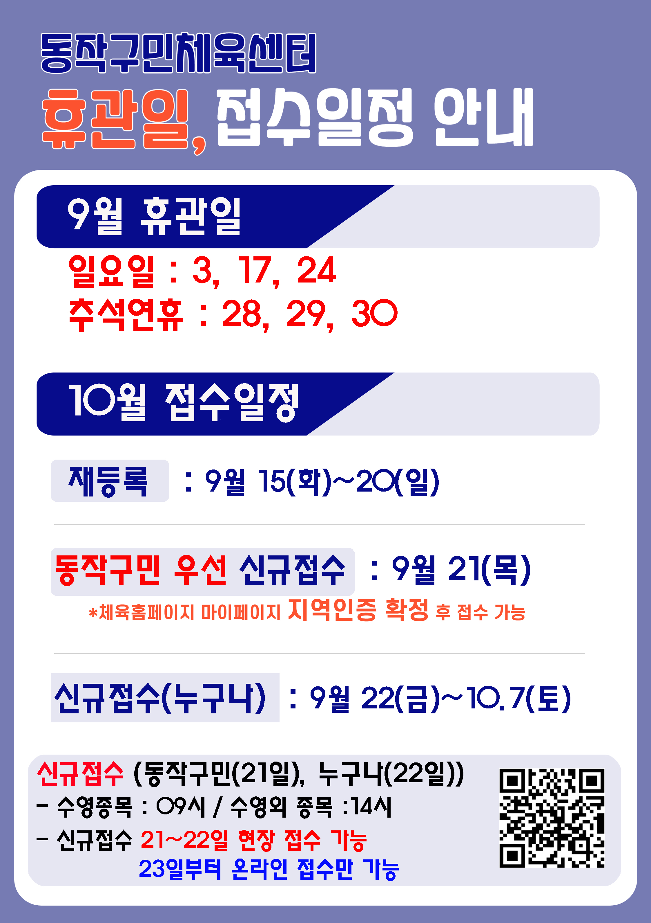 동작구민체육센터 동작구민체육센터 9월 휴관일 및 10월 접수 안내 작성자 동작구민체육센터 작성일 2023년 8월 31일 14시 25분 38초 조회 1,082 휴관일안내(2023) 09.JPG [ Size : 1.7MB , Down : 1,375 ] 미리보기 다운로드 목록보기