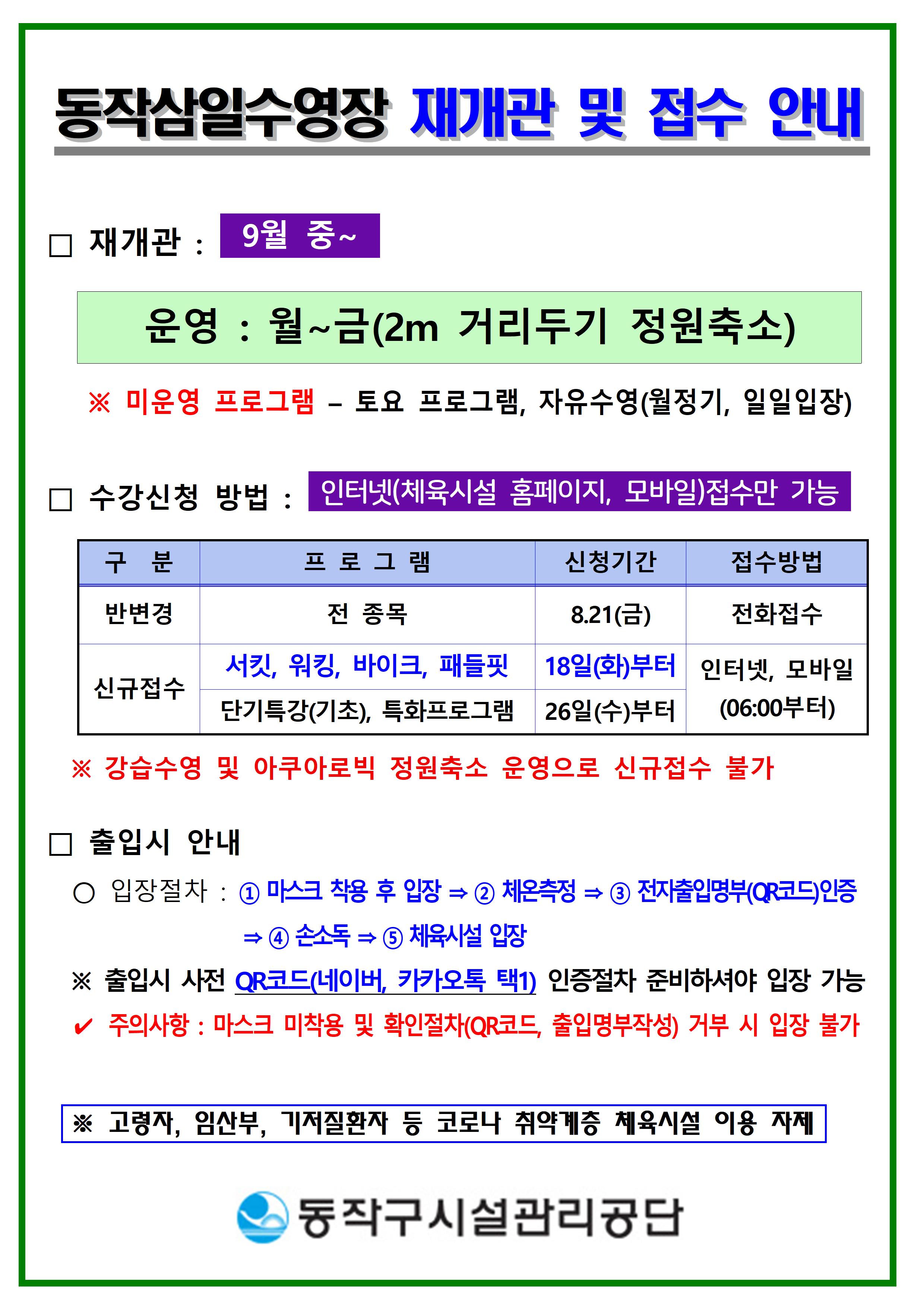 삼일수영장 동작삼일수영장 재개관 및 9월 신규접수 안내(일정변경) 작성자 삼일수영장 작성일 2020년 8월 18일 15시 22분 59초 조회 1,551 4.재개관 접수안내(본부공지양식)수정001.jpg [ Size : 725.48KB , Down : 1,675 ] 미리보기 다운로드 9월 신규모집안내(0818수정)001.jpg [ Size : 594.75KB , Down : 1,496 ] 미리보기 다운로드 목록보기