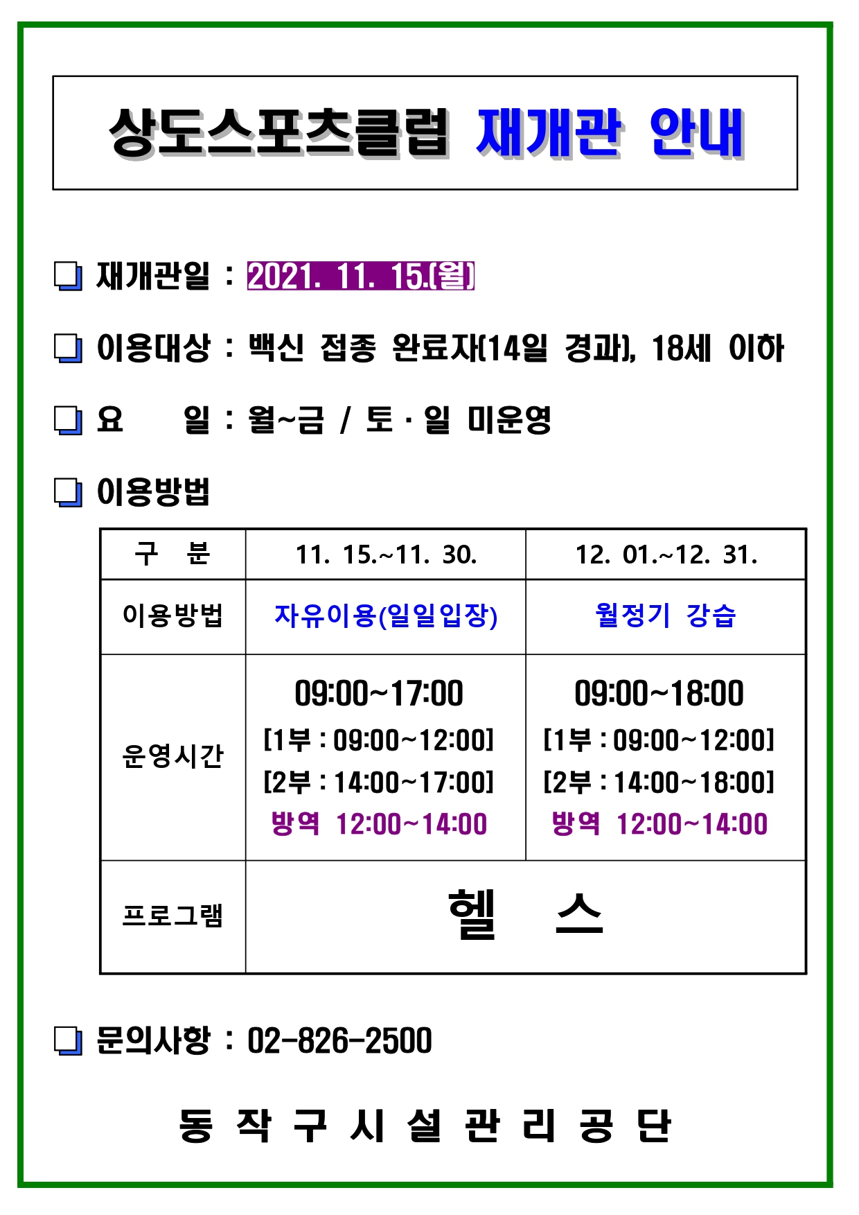 상도스포츠클럽 상도스포츠클럽 11월 재개관 운영 안내 작성자 상도스포츠클럽 작성일 2021년 11월 3일 17시 50분 2초 조회 903 체육시설 재개관 및 접수 안내문_상도_page-0001.jpg [ Size : 464.89KB , Down : 954 ] 미리보기 다운로드 목록보기