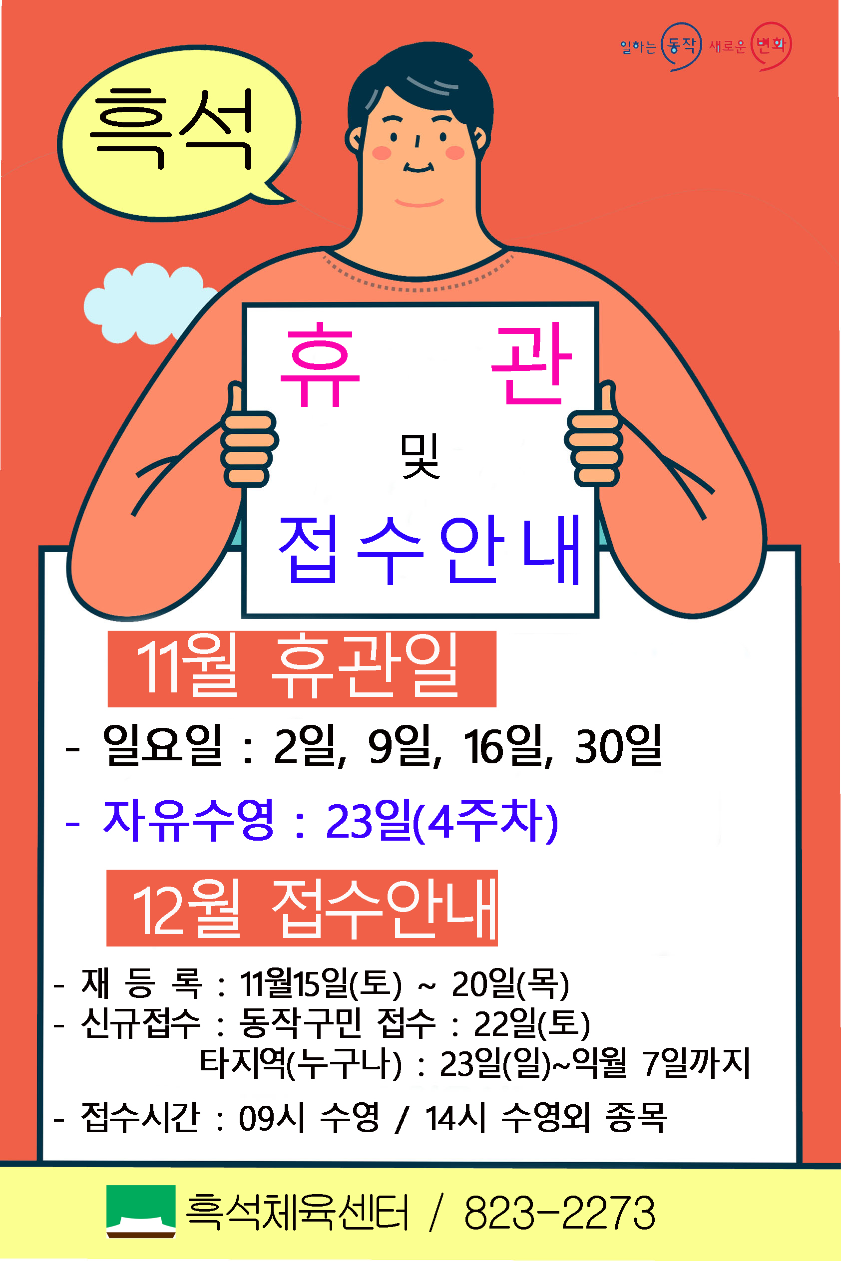 흑석체육센터 흑석체육센터 11월 휴관일 및 12월 접수일정 안내 작성자 동작구민체육센터 작성일 2025년 11월 3일 11시 36분 9초 조회 377 11월 휴관안내문.jpg [ Size : 822.84KB , Down : 310 ] 미리보기 다운로드 목록보기