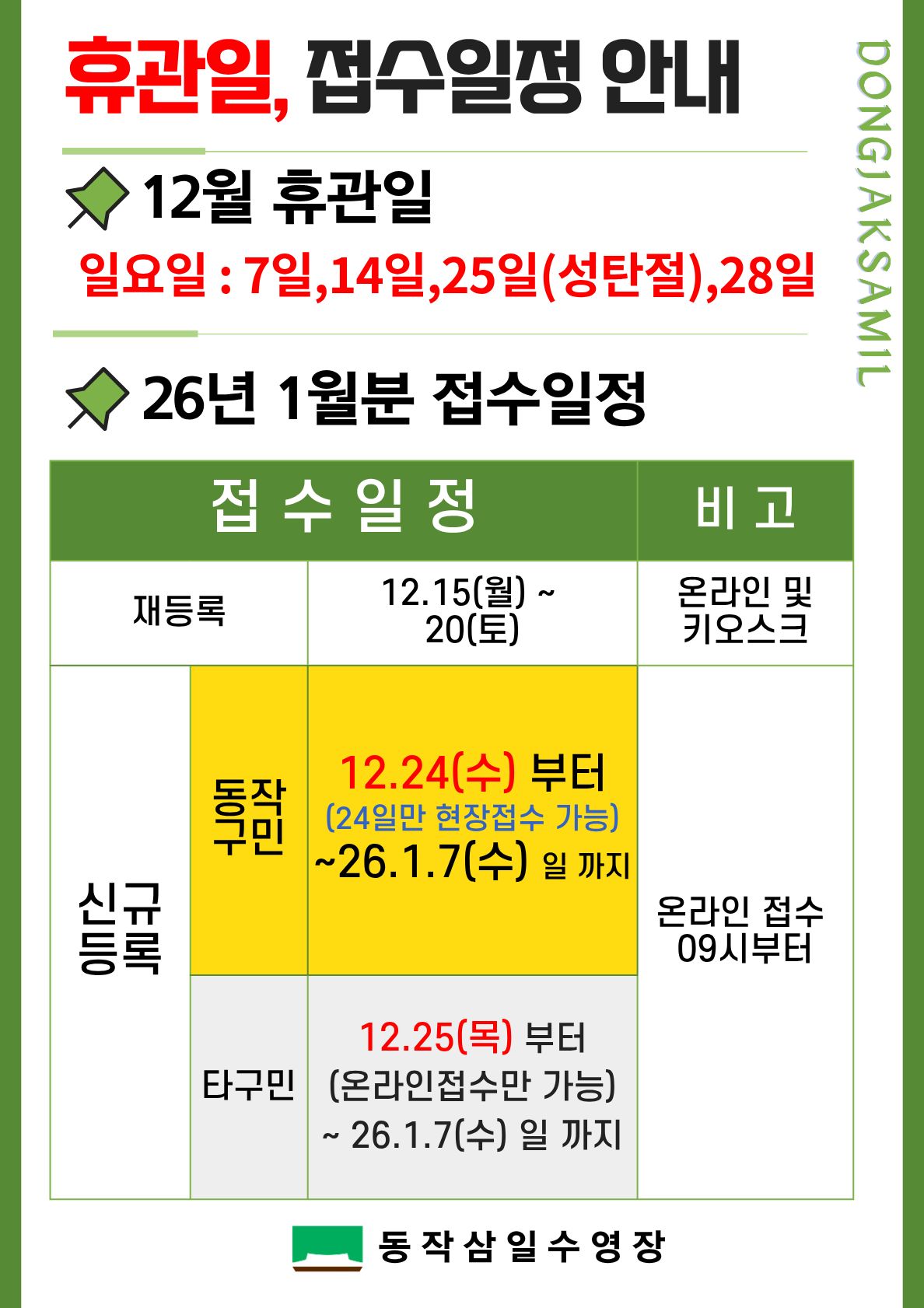 삼일수영장 동작삼일수영장 12월 휴관일 및 26년 1월분 접수일정안내 작성자 동작구민체육센터 작성일 2025년 11월 26일 13시 57분 12초 조회 398 내12월 휴관일 및 접수일정안.jpg [ Size : 180KB , Down : 362 ] 미리보기 다운로드 목록보기