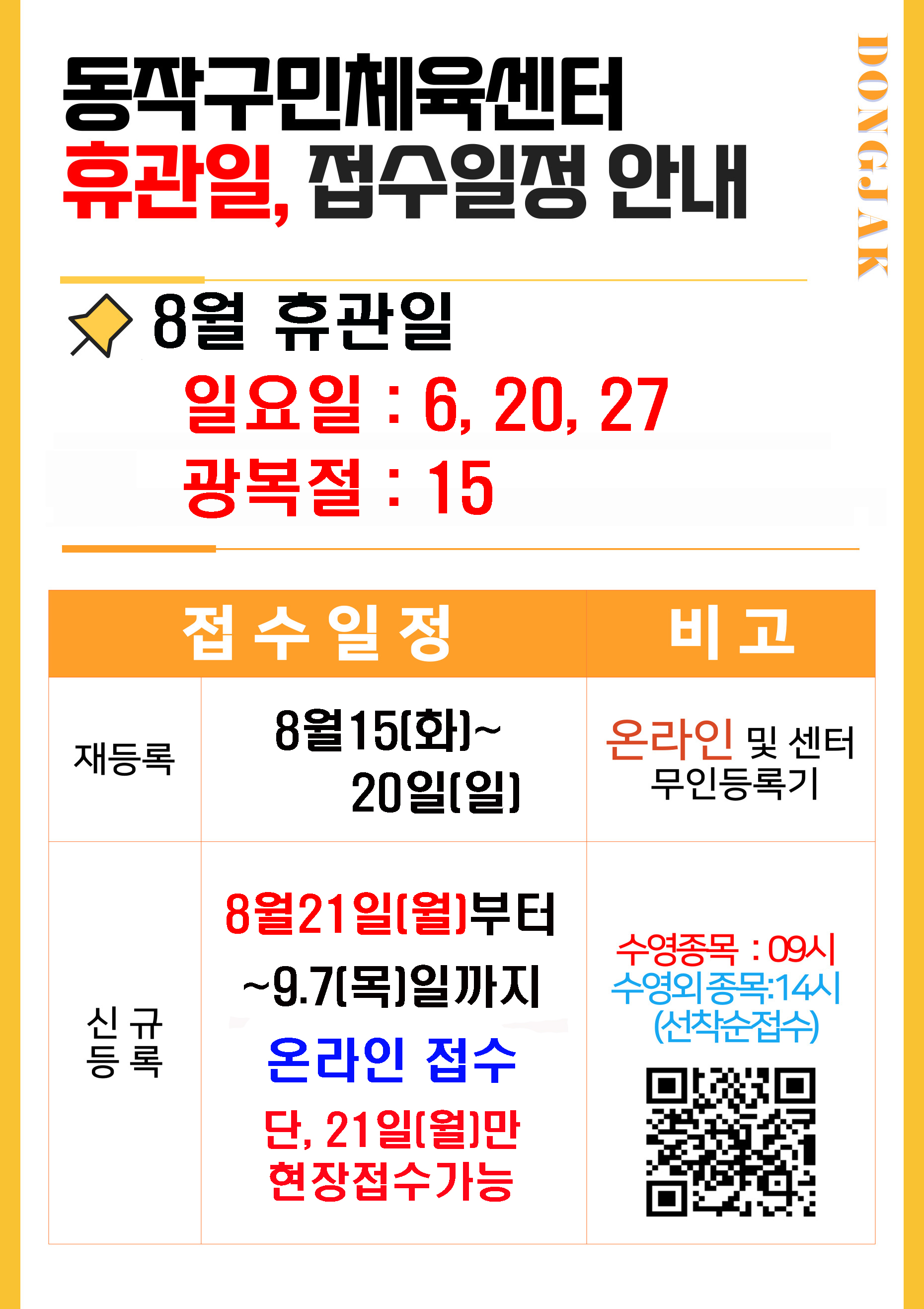 동작구민체육센터 동작구민체육센터 8월 휴관일 및 9월 접수 안내 작성자 동작구민체육센터 작성일 2023년 8월 14일 11시 30분 1초 조회 1,274 8월 접수일정(2023).JPG [ Size : 1.18MB , Down : 645 ] 미리보기 다운로드 목록보기