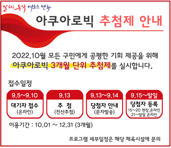 전체 아쿠아로빅 추첨제 변경안내 작성자 본부 작성일 2022년 8월 24일 17시 54분 5초 조회 774 아쿠아로빅 접수방법 변경-1 copy.jpg [ Size : 215.63KB , Down : 793 ] 미리보기 다운로드 목록보기