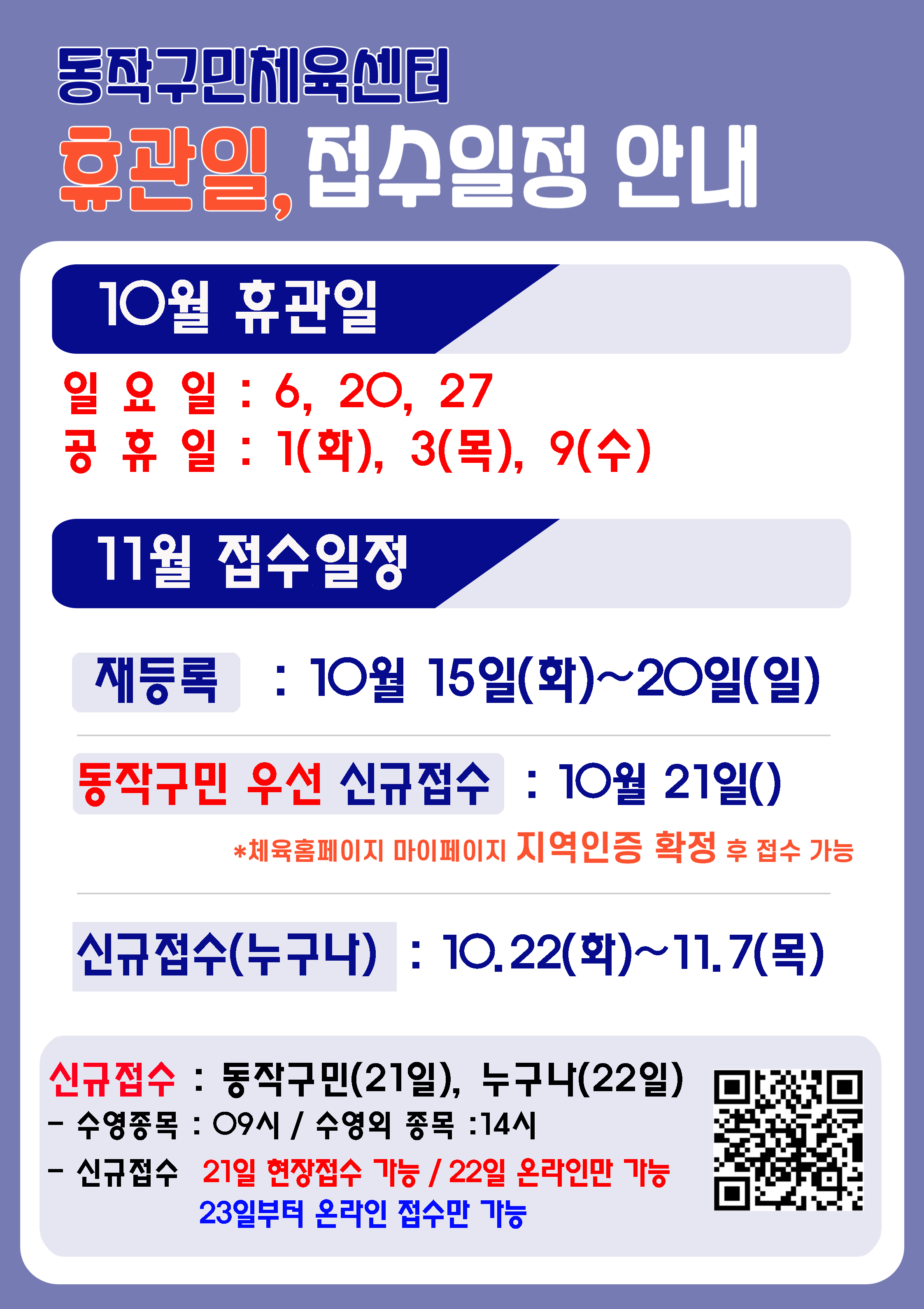 동작구민체육센터 동작구민체육센터 10 휴관안내 및 11월 접수일정안내 작성자 동작구민체육센터 작성일 2024년 9월 23일 14시 19분 50초 조회 1,182 휴관일안내10월.JPG [ Size : 1.78MB , Down : 271 ] 미리보기 다운로드 목록보기