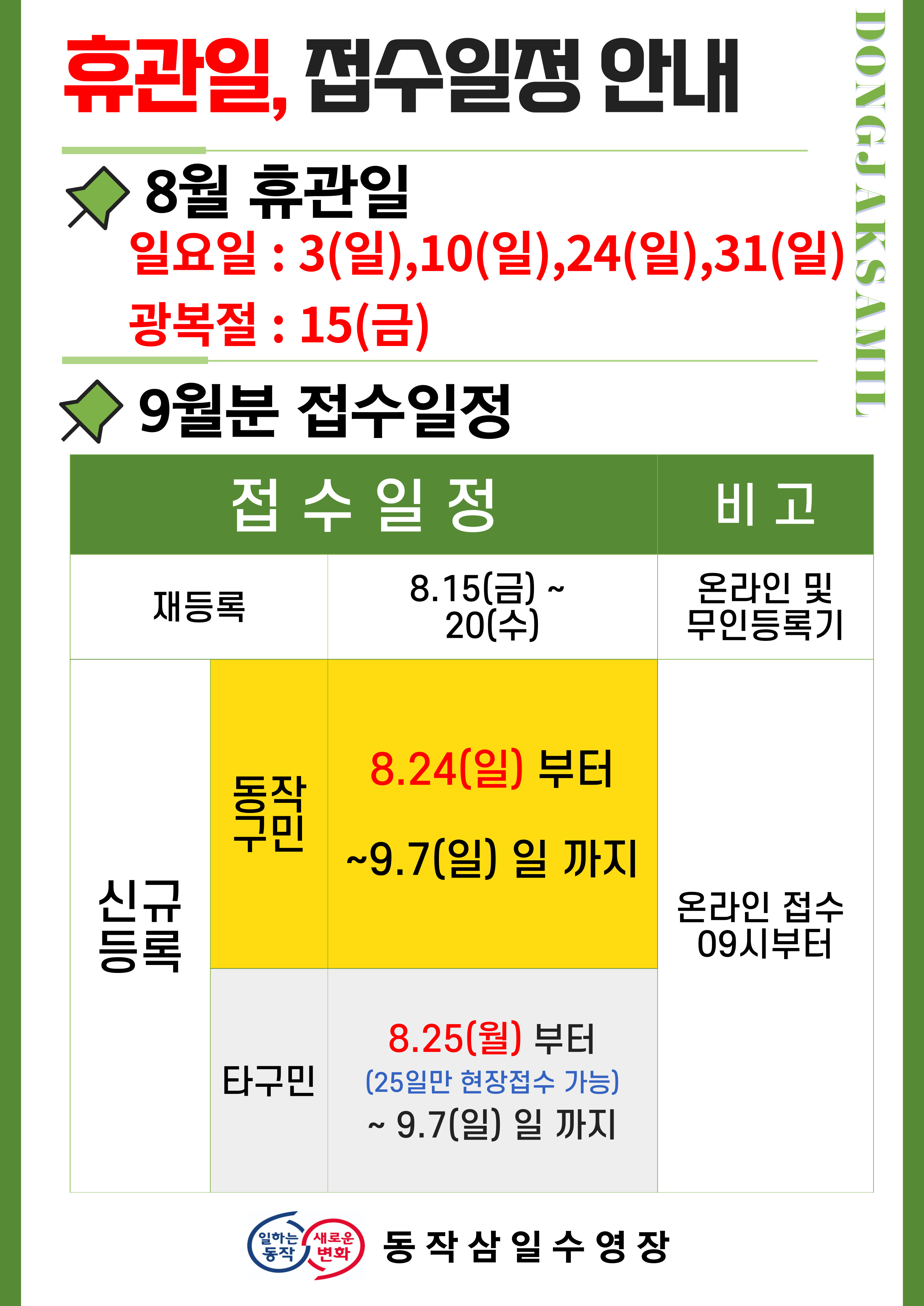 삼일수영장 동작삼일수영장 8월 휴관일 및 9월 접수일정 안내 작성자 동작구민체육센터 작성일 2025년 7월 28일 11시 4분 32초 조회 678 8월 휴관일 9월 접수분.jpg [ Size : 848.04KB , Down : 99 ] 미리보기 다운로드 목록보기