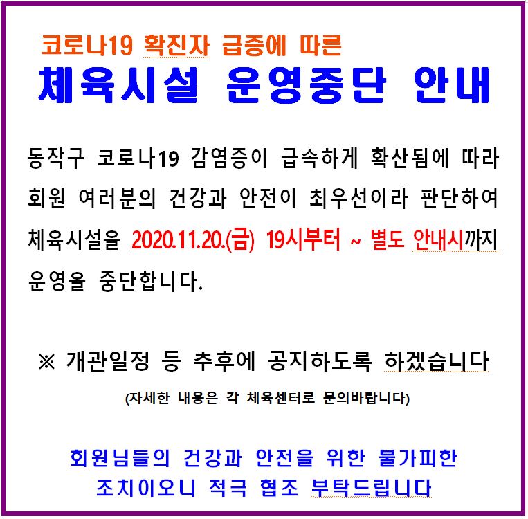 전체 동작구시설관리공단 체육시설 휴관안내 작성자 흑석체육문화센터 작성일 2020년 11월 24일 9시 29분 26초 조회 3,101 운영중단안내.JPG [ Size : 104.82KB , Down : 3,710 ] 미리보기 다운로드 목록보기