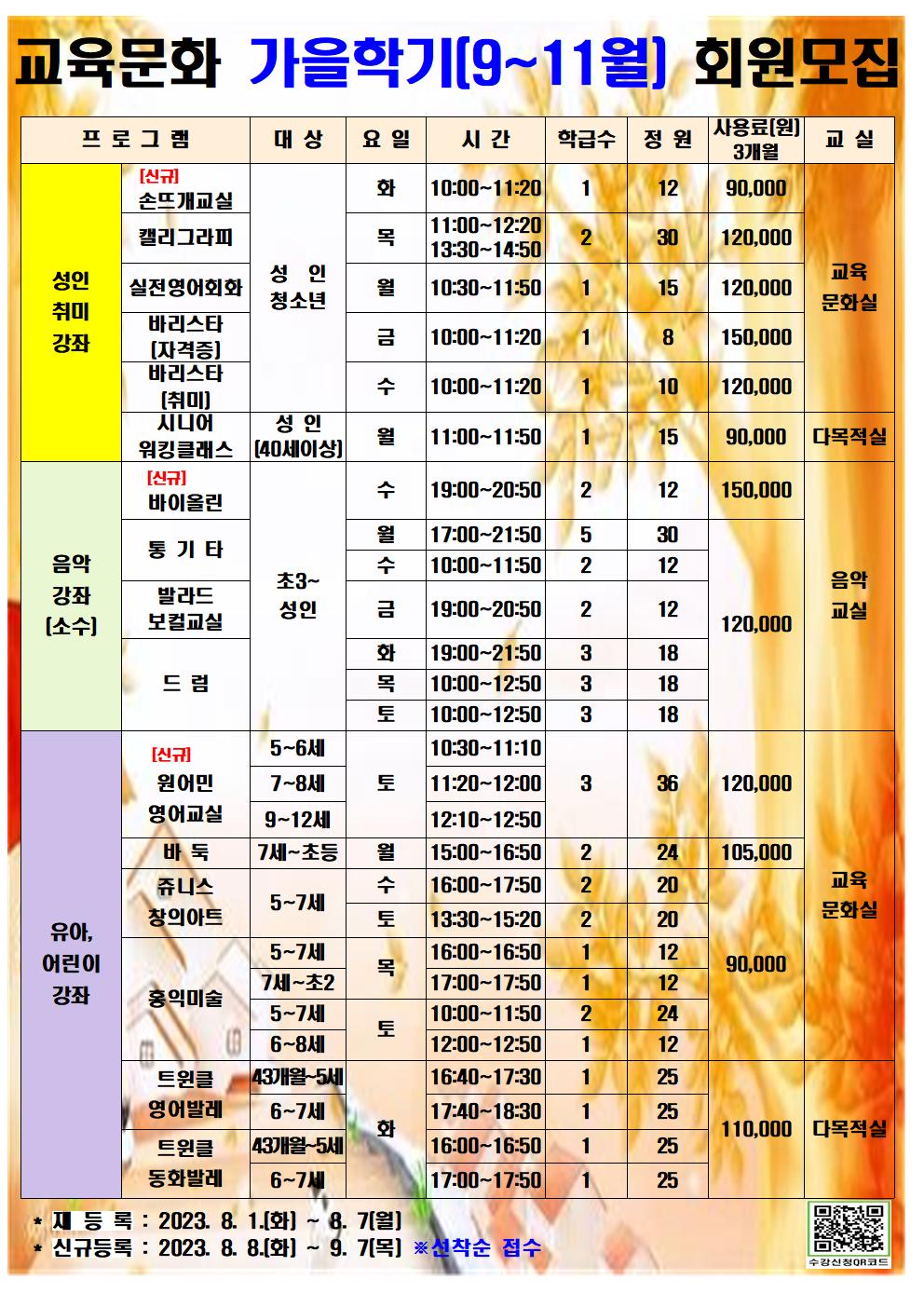 사당종합체육관 사당종합체육관 교육문화 가을학기(9~11월) 회원모집 안내 작성자 동작구민체육센터 작성일 2023년 8월 16일 10시 59분 55초 조회 598 가을 홍보물(A1)001.jpg [ Size : 266.24KB , Down : 633 ] 미리보기 다운로드 손뜨개교실(가을학기수정).jpg [ Size : 6.48MB , Down : 795 ] 미리보기 다운로드 원어민영어(가을학기).jpg [ Size : 3.62MB , Down : 897 ] 미리보기 다운로드 음악교실(가을학기).jpg [ Size : 6.96MB , Down : 864 ] 미리보기 다운로드 목록보기