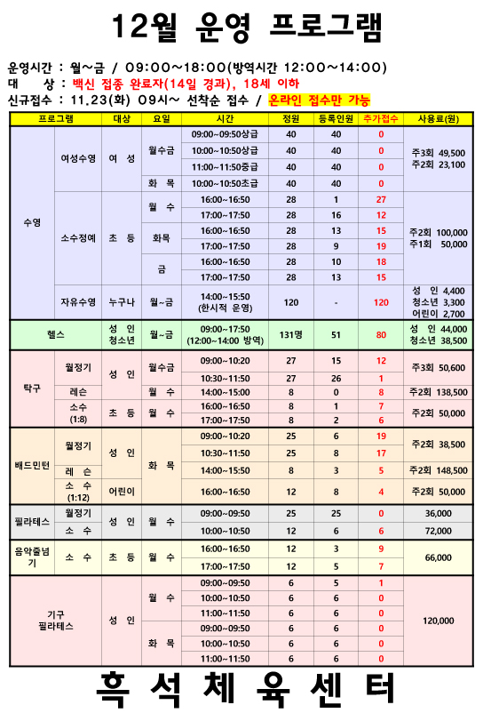 흑석체육센터 흑석체육센터 12월 운영 프로그램 작성자 흑석체육문화센터 작성일 2021년 11월 18일 13시 19분 46초 조회 873 12월 운영프로그램 수정.jpg [ Size : 291.4KB , Down : 827 ] 미리보기 다운로드 목록보기