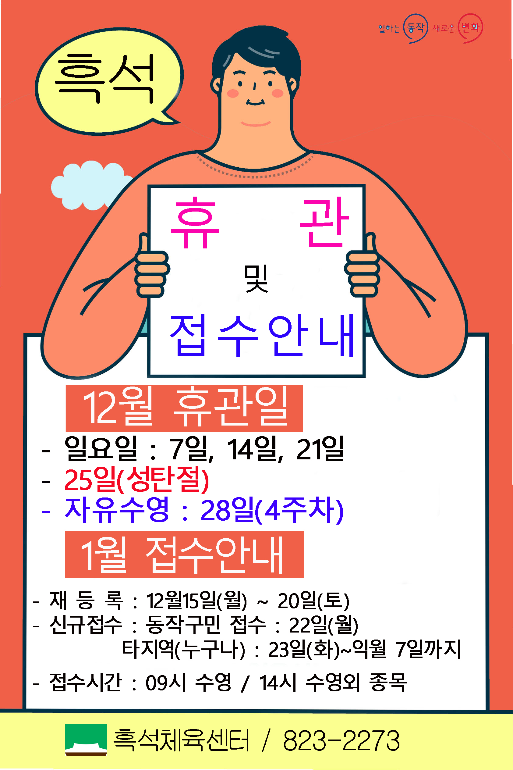 흑석체육센터 흑석체육센터 12월 휴관일 및 1월 접수일정 안내 작성자 동작구민체육센터 작성일 2025년 11월 28일 21시 24분 37초 조회 497 12월 휴관안내문.jpg [ Size : 857.31KB , Down : 952 ] 미리보기 다운로드 목록보기