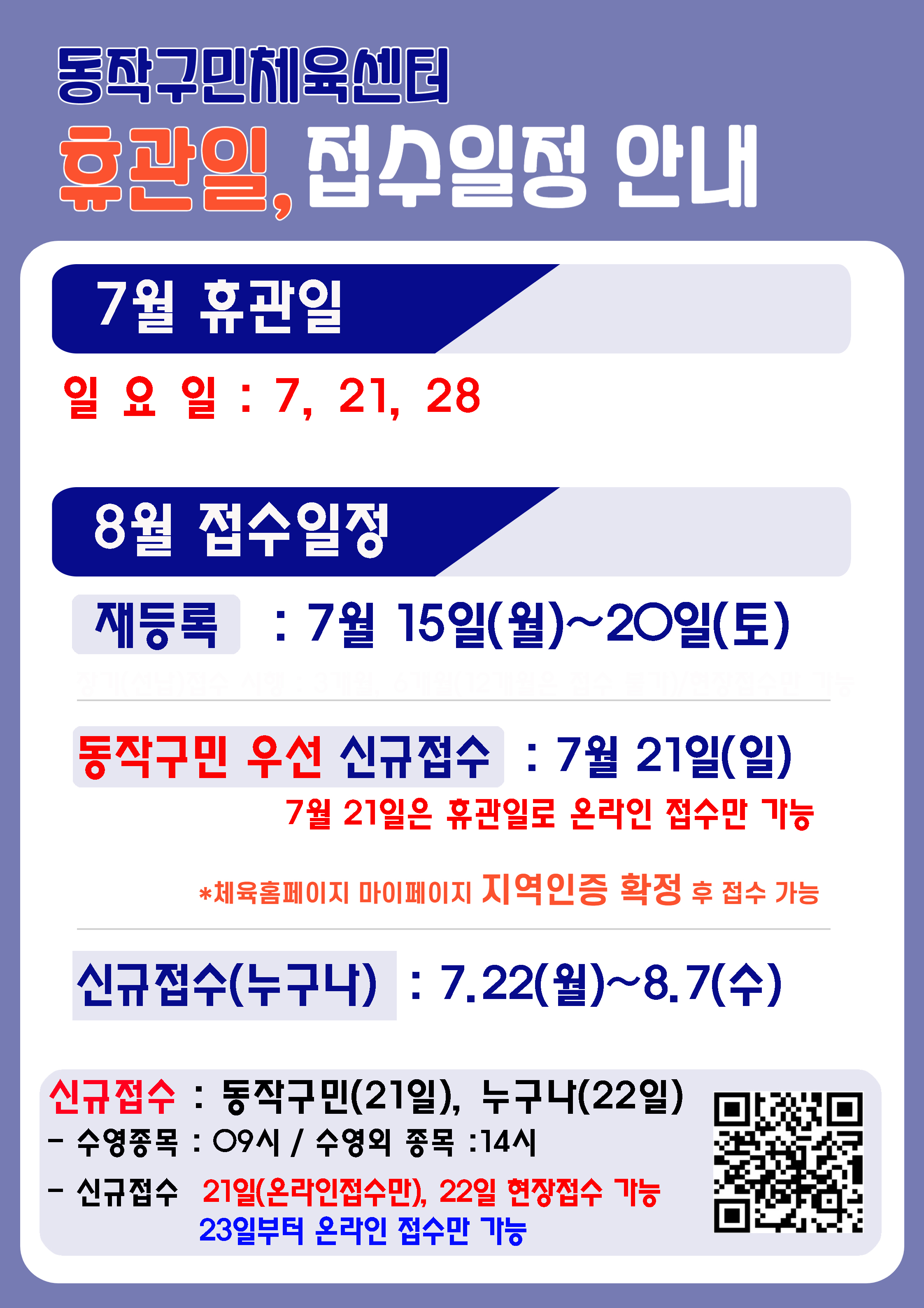 동작구민체육센터 동작구민체육센터 7월 휴관안내 및 8월 접수일정안내 작성자 동작구민체육센터 작성일 2024년 6월 27일 14시 47분 34초 조회 856 휴관일안내(2024) 7월휴관.JPG [ Size : 1.76MB , Down : 262 ] 미리보기 다운로드 목록보기