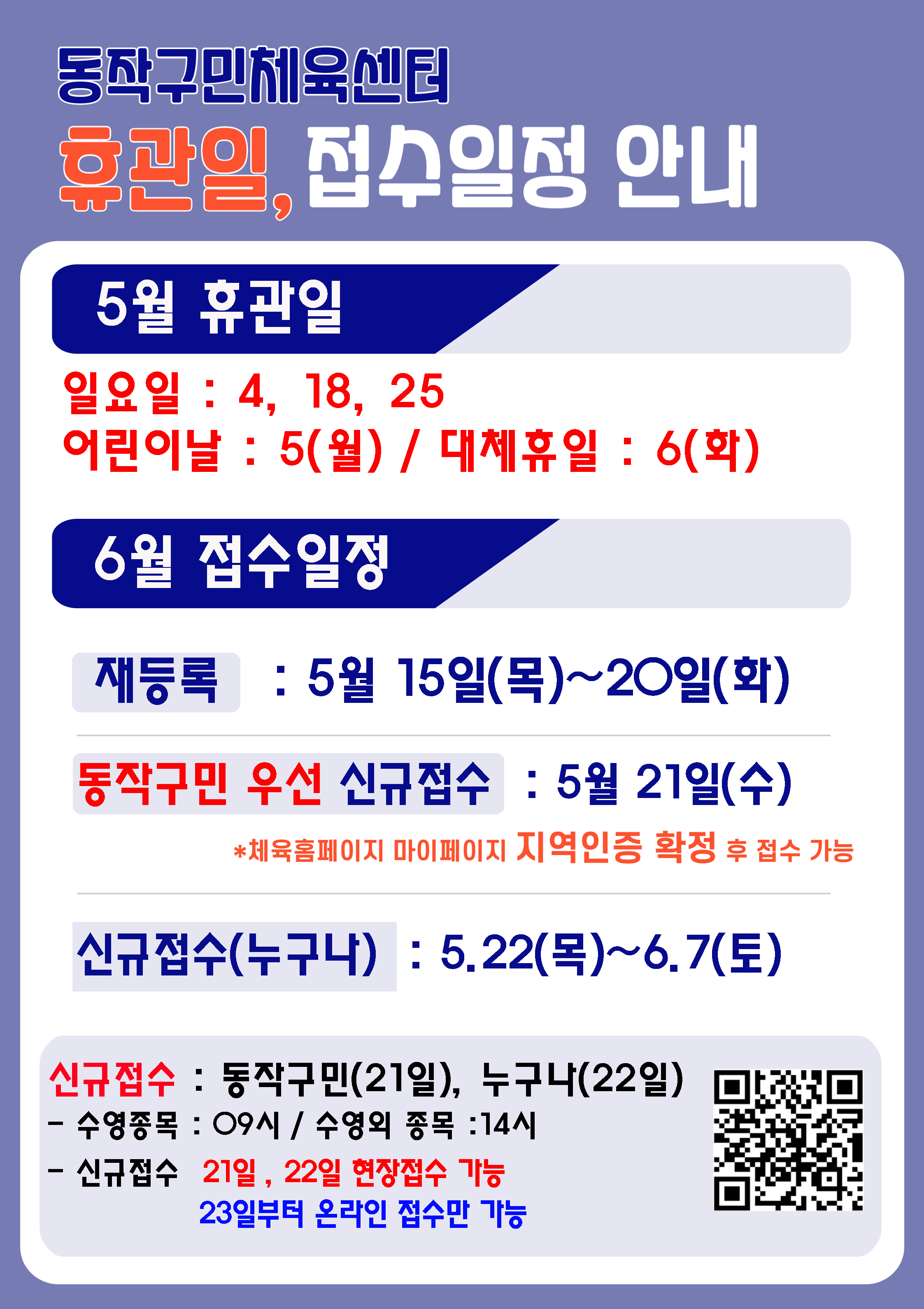 동작구민체육센터 동작구민체육센터 5월 휴관일 및 6월 접수 안내 작성자 동작구민체육센터 작성일 2025년 4월 28일 20시 27분 57초 조회 1,369 휴관일안내(2025.5) copy.JPG [ Size : 1.75MB , Down : 224 ] 미리보기 다운로드 5월1일(근로자의날)은 프로그램 전체 정상운영됩니다. 목록보기
