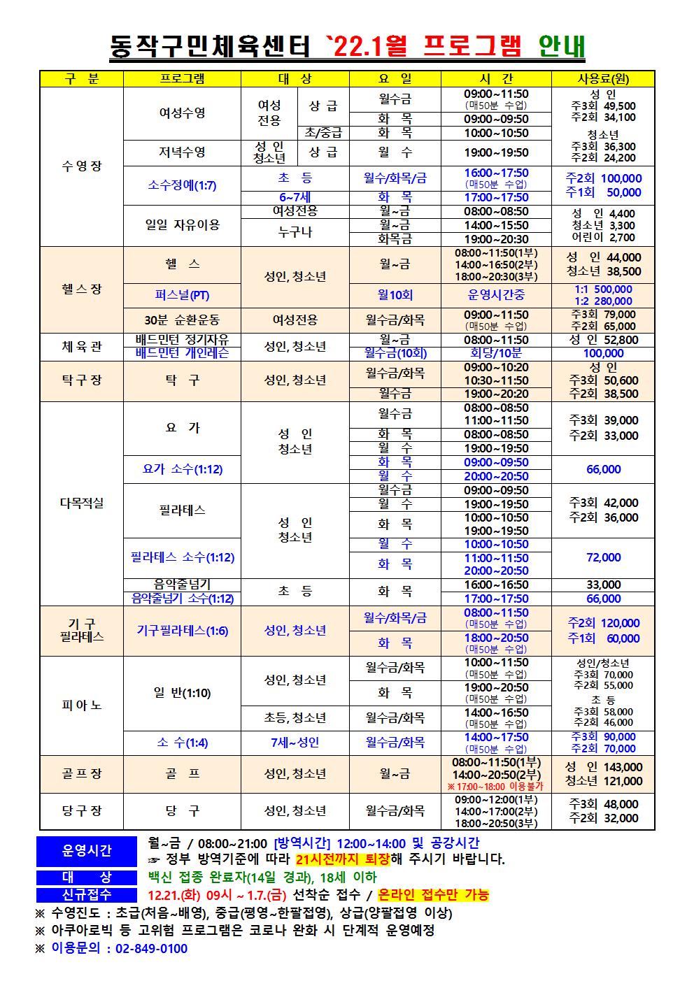 동작구민체육센터 동작구민체육센터 1월 프로그램 안내 작성자 사당문화회관 작성일 2021년 12월 20일 9시 50분 29초 조회 1,037 1월 프로그램 안내 동작구민체육센터(12.20)최종001.jpg [ Size : 288.86KB , Down : 873 ] 미리보기 다운로드 목록보기