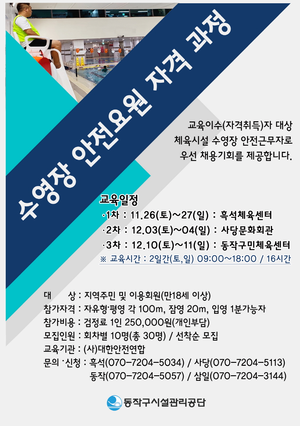 동작구시설관리공단 체육시설 "수영장 안전요원 자격 취득과정" 운영 작성자 사당문화회관 작성일 2022년 11월 9일 15시 27분 3초 조회 815 수영장 안전요원 육성 copy.JPG [ Size : 493.87KB , Down : 488 ] 미리보기 다운로드 목록보기