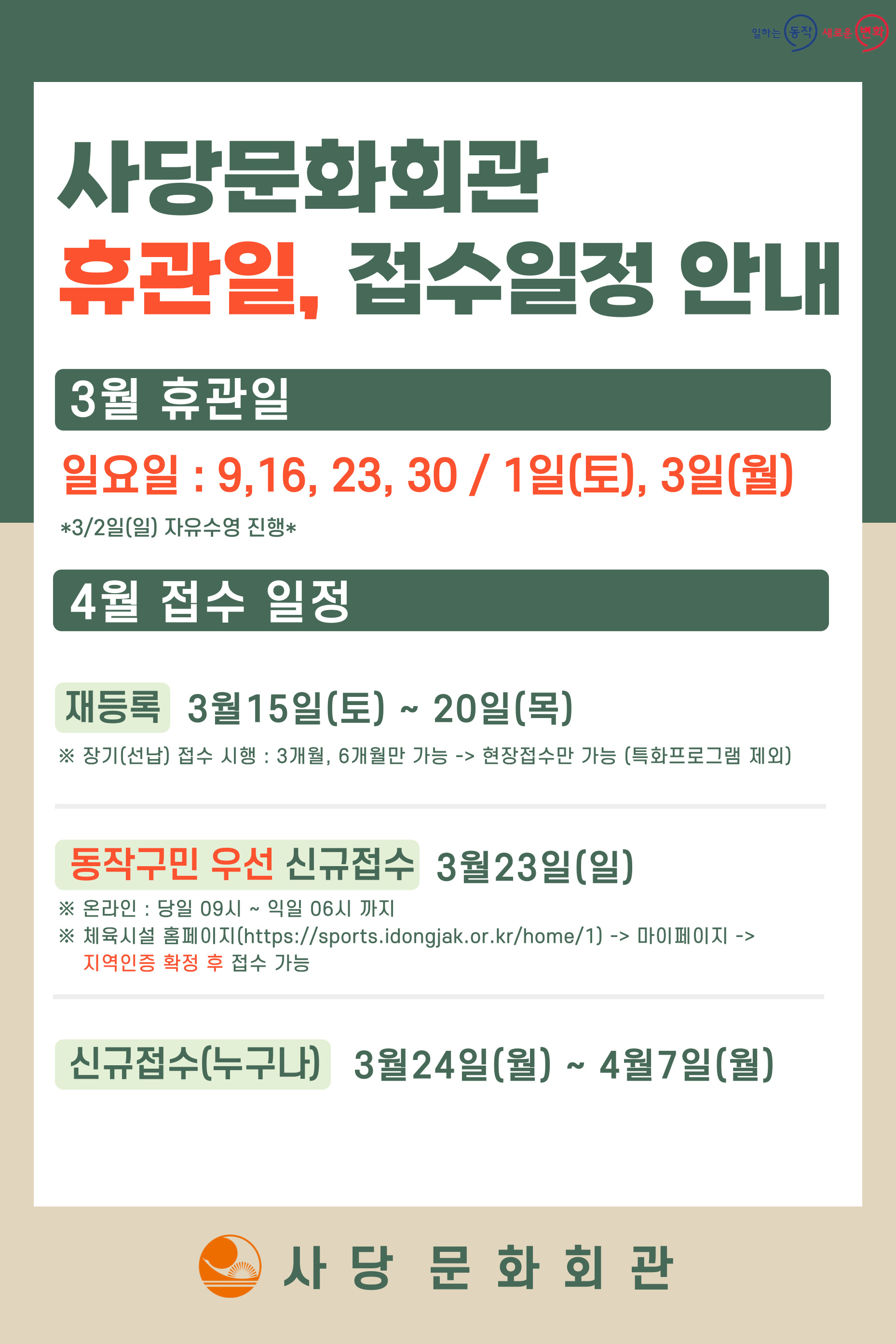 사당문화회관 사당문화회관 3월 휴관일 및 4월 접수 안내 작성자 사당문화회관 작성일 2025년 2월 28일 21시 37분 38초 조회 687 휴관일-접수-일정-012.jpg [ Size : 500.22KB , Down : 557 ] 미리보기 다운로드 목록보기