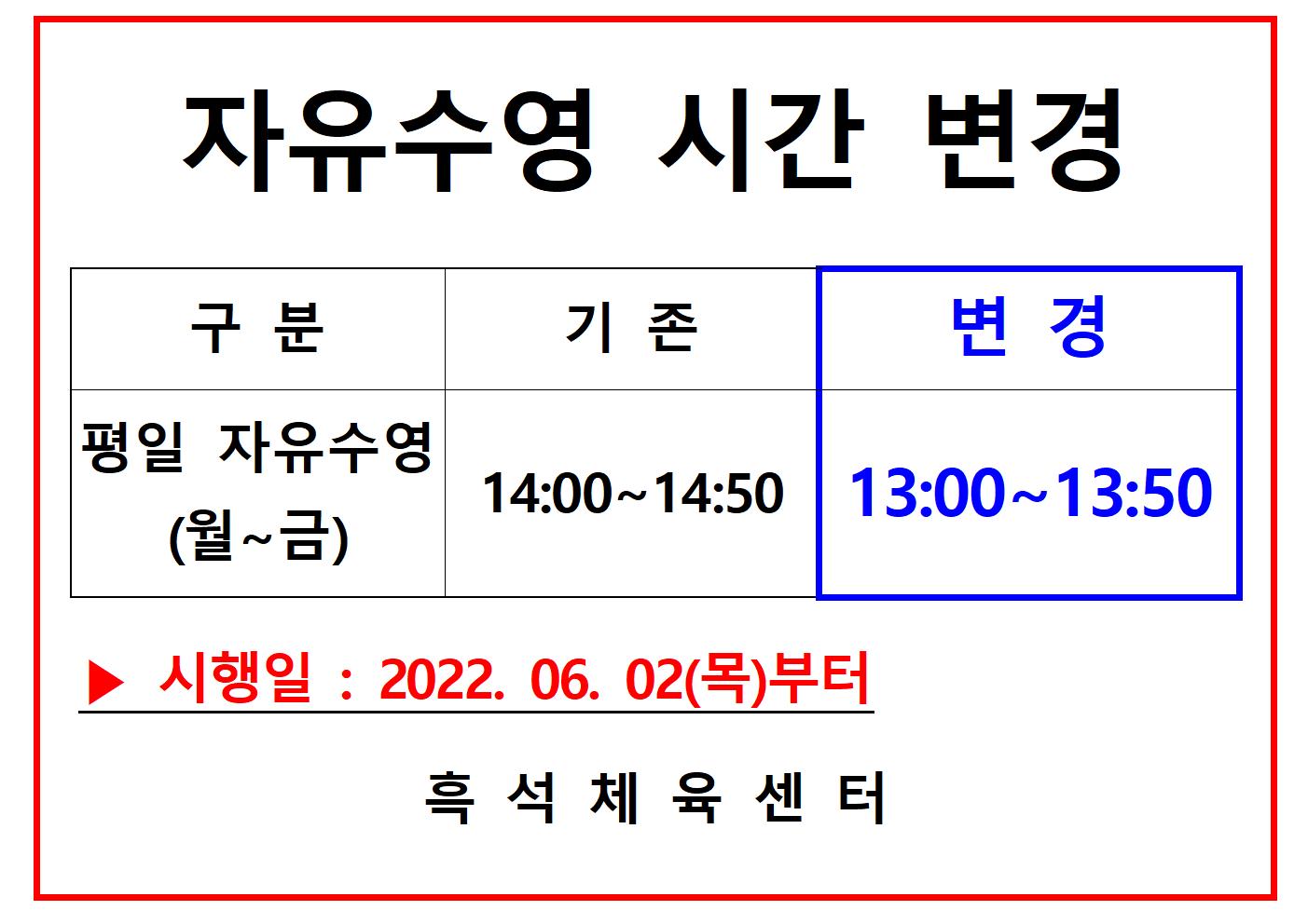 흑석체육센터 흑석체육센터 자유수영 시간 변경 안내 작성자 흑석체육문화센터 작성일 2022년 5월 12일 11시 5분 27초 조회 1,024 자유수영시간 변경001.jpg [ Size : 122.14KB , Down : 280 ] 미리보기 다운로드 목록보기